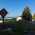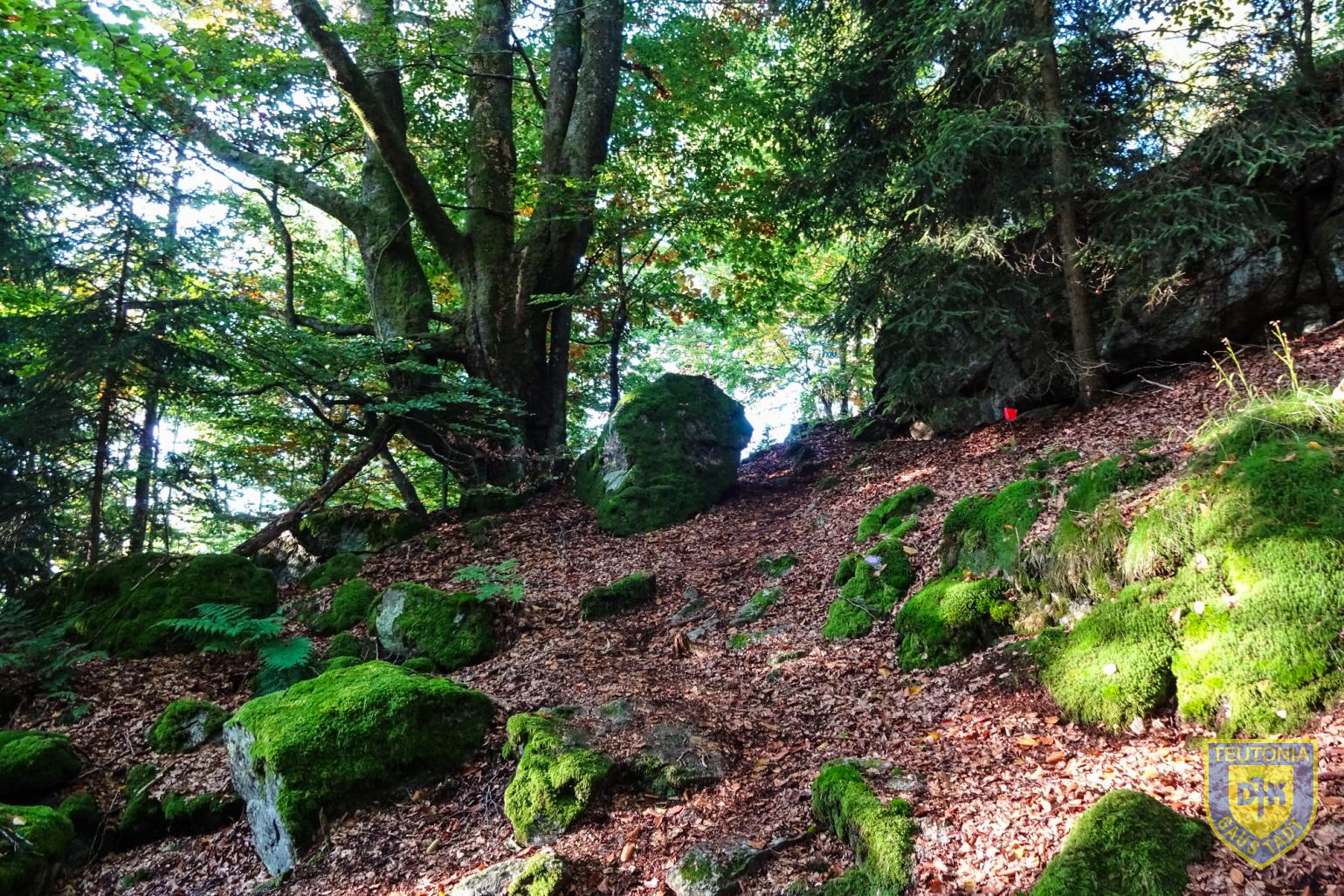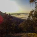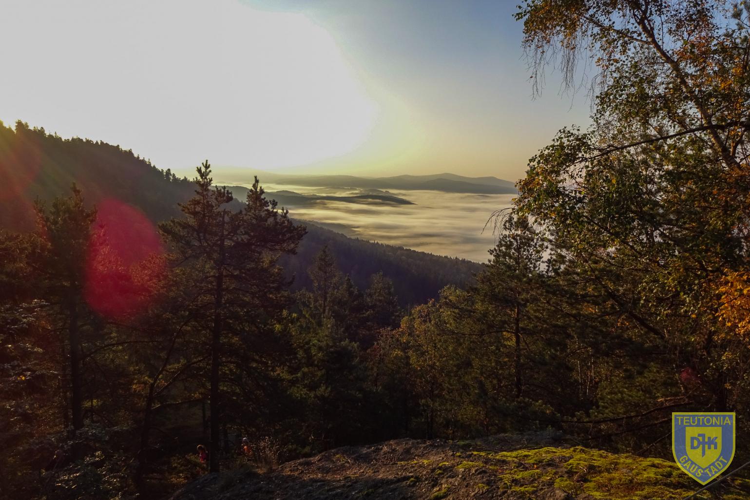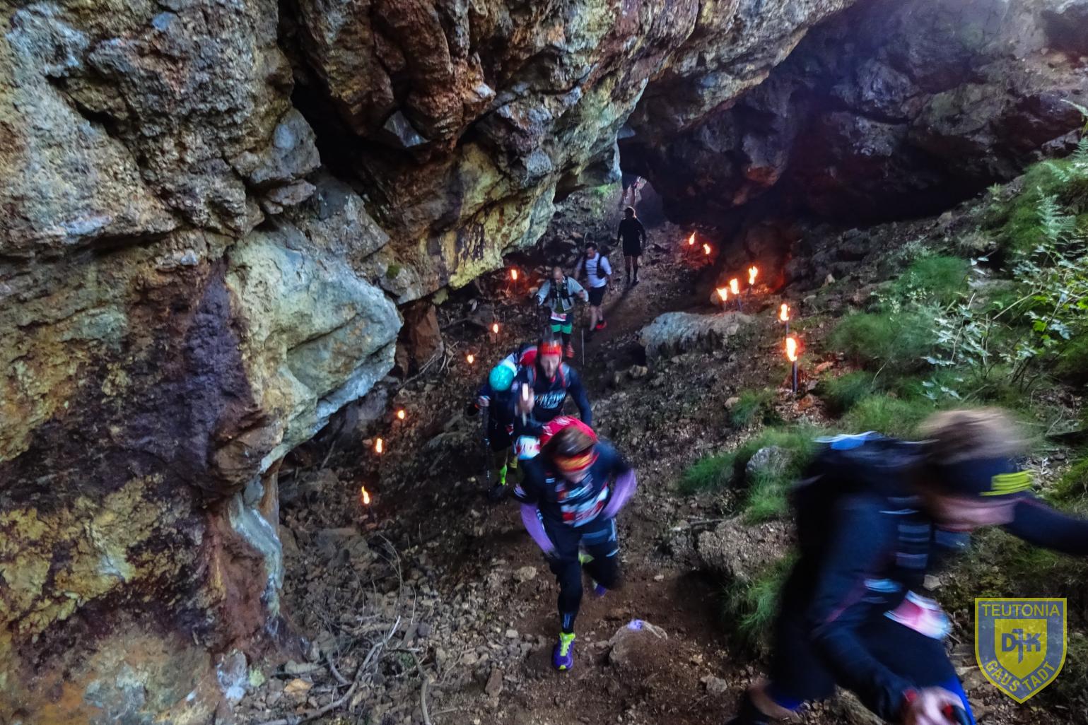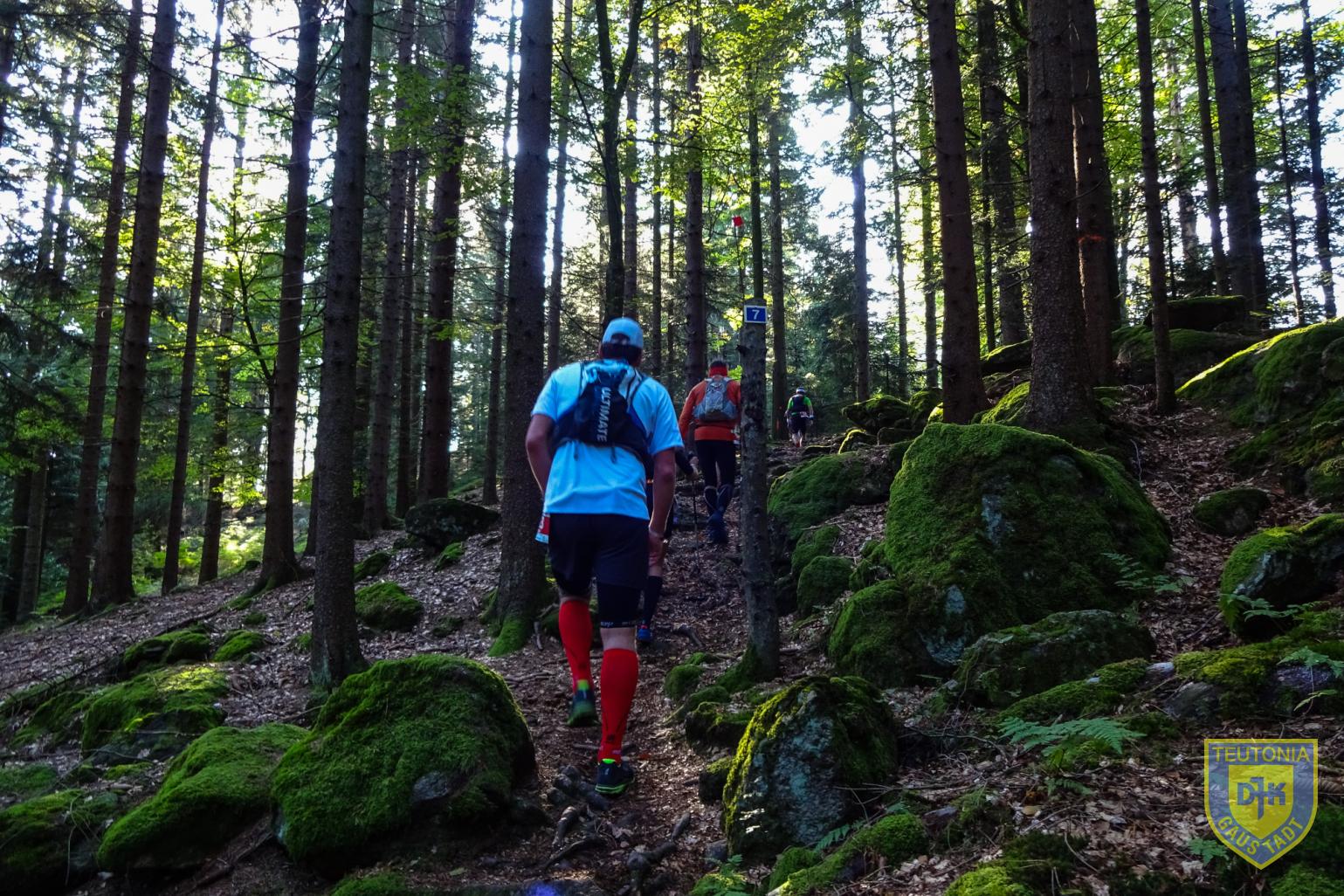 Nach dem Start geht es kurz durch den Ort, um warm zu werden, denn nach dem ersten Kilometer beginnt bereits der erste Anstieg zum 955 Meter hohen Silberberg. Auf dem Weg passieren wir eine Höhle, die von Fackeln beleuchtet wird und können von oben die Aussicht genießen. In den Tälern hängt der Nebel und nur die Bergspitzen erheben sich über dieses Meer. Über schöne Wege, auf denen man es gut laufen lassen kann geht es gleich wieder bergab, bevor der nächste Anstieg zum 983 Meter hohen Kronberg beginnt. Auf dem Weg zum Berg erreichen wir die erste Versorgungsstation und schnell wird klar, den Läuferinnen und Läufern wird es an nichts fehlen: Es gibt heißen Tee, ISO-Getränke, Wasser, Bier, verschiedene Obstsorten, Semmeln, Käsewürfel, Nüsse, Tomaten, Gurken, Kuchen, Süßes und Gels. Nach einem kurzen Aufenthalt geht es weiter auf schmalen Waldwegen bergauf. Die Strecke ist durchgängig mit kleinen roten Fähnchen und lila Pfeilen markiert, was ein verlaufen verhindert. In einem ständigen Auf-und-Ab führt die Strecke an der 869 Meter hohen Strohmannhanselhöhe vorbei und über die 914 Meter hohe Harlachberger Spitze.