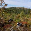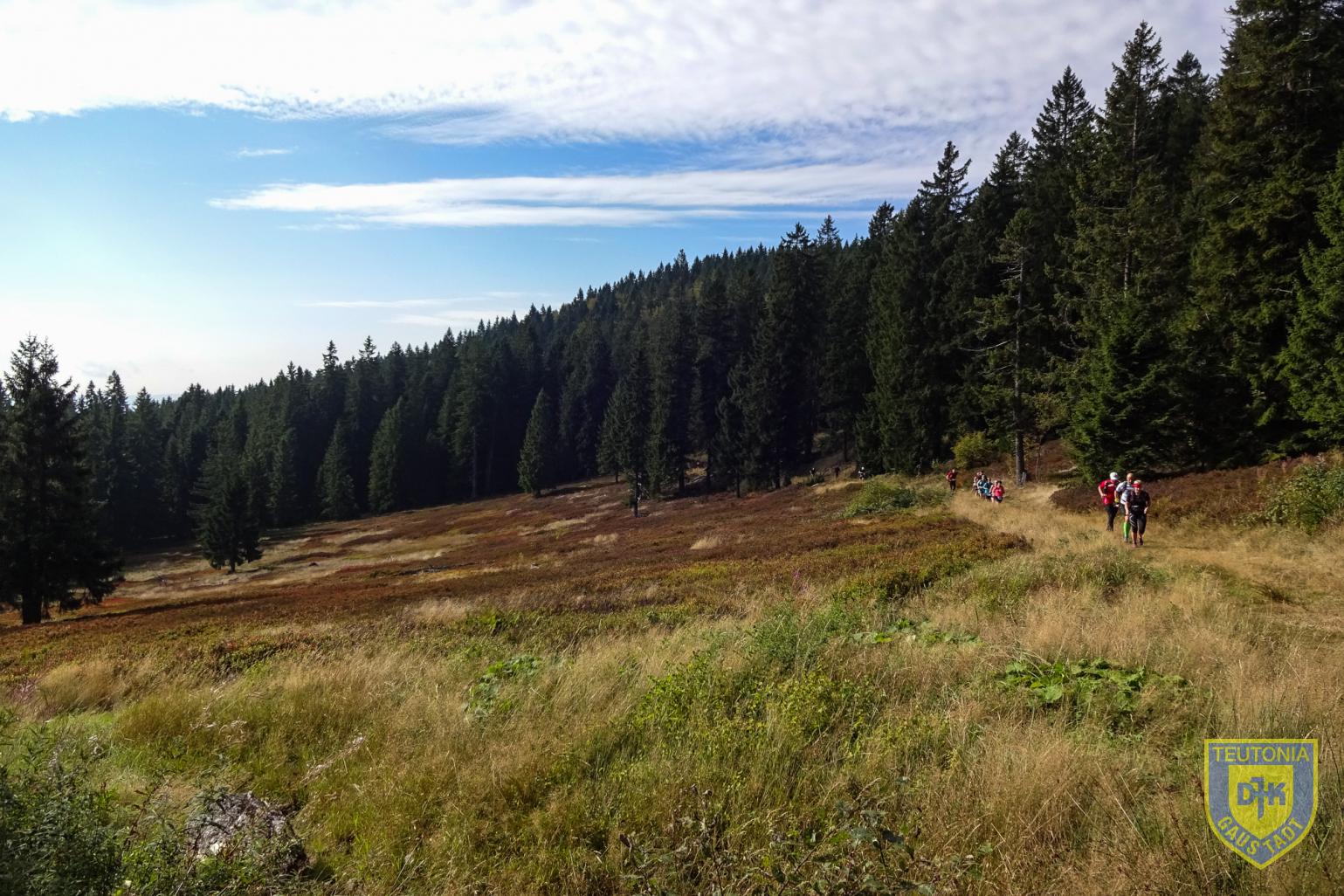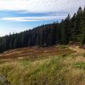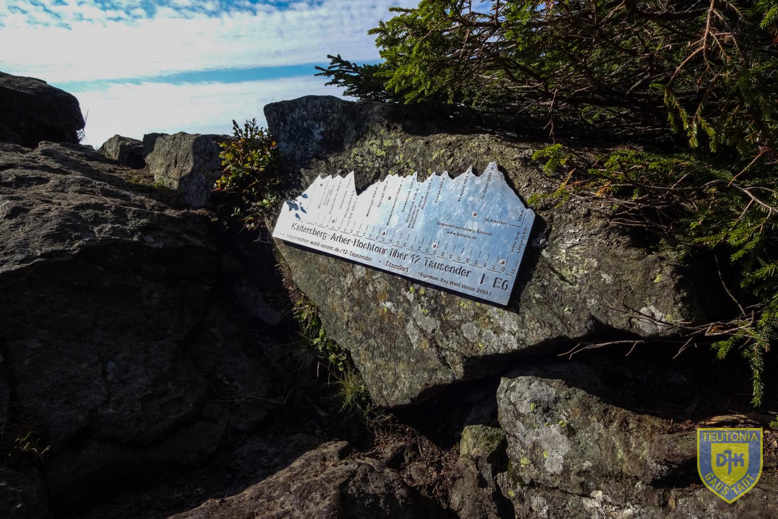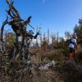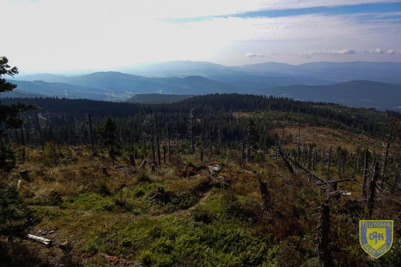 Kurz vor km 30 erreichten wir die sehr schön gelegene Versorgungsstation „Tausender“ und waren erstmalig auf 1000 Meter. Nach wenigen Minuten schwenkten wir zwischen Enzian und Kleiner Arber auf den Goldsteig, dem wir über den 1384 Meter hohen Kleinen Arber folgten. Uns bot sich eine spektakuläre Aussicht über die umliegende Landschaft mit den vielen abgestorbenen Bäumen und der sich verfärbenden Natur. Kurz vor dem Gipfel hieß es kraxel: Es ging über hohe Felsen direkt zum Gipfel mit Gipfelkreuz. Nach einer Verschnaufpause und einem Rundblick auf der anderen Seite wieder runtersteigen und auf einem technisch anspruchsvollen Downhill etwa 150 Hm bergab. Wir wussten ja, was nun kommt… der Anstieg zum Großen Arber… Nochmals knapp 2 km steiler Anstieg mit vielen Treppenstufen, aber einer tollen Landschaft! Oben angekommen, hieß es erst mal durchatmen. Etwas ungewohnt war es hier oben, waren doch so viele Menschen hier. Da merkte man wieder, auf den Berg führt eine Seilbahn… Die Strecke verlief kurz unterhalb des Gipfelkreuzes vorbei und anschließend sofort wieder bergab zum Arberschutzhaus, wo die nächste Versorgungsstation wartete. Hier fiel es schwer, sich von den ganzen Leckereien loszureißen und weiterzulaufen, aber die Kraft war noch da und das Laufen machte einfach Spaß! Über den Arberweg ging es nun auf dem technisch schwierigsten Abschnitt des gesamten Rennens zum großen Arbersee auf 940 Meter. Der Weg war größtenteils ein felsiger Pfad, der absolute Trittsicherheit und Konzentration erforderte, aber absolut genial zum Laufen war!