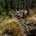 Bis etwa km 25 wechseln sich die Anstiege und gut laufbaren Passagen immer wieder ab und es macht einfach nur Spaß, dabei zu sein! Bei Joska Kristall erwartet uns die dritte Versorgungsstation und schön langsam beginnt der Anstieg zum Kleinen und Großen Arber. Auf traumhaften Trails laufen wir durch den Naturpark Bayerischer Wald und kommen am Hochfall, einem Wasserfall vorbei. Kurz darauf wurde es etwas enger auf der Strecke, denn die Läuferinnen und Läufer des Auerhahntrails über 35 km stießen zu den Ultraläuferinnen und -läufern. Nach ein paar Minuten hatte sich das Feld wieder entzerrt und weiter ging es den höchsten Bergen des Bayerischen Waldes entgegen. Inzwischen stand die Sonne schon hoch und bei den Passagen außerhalb des Waldes war es angenehm warm.