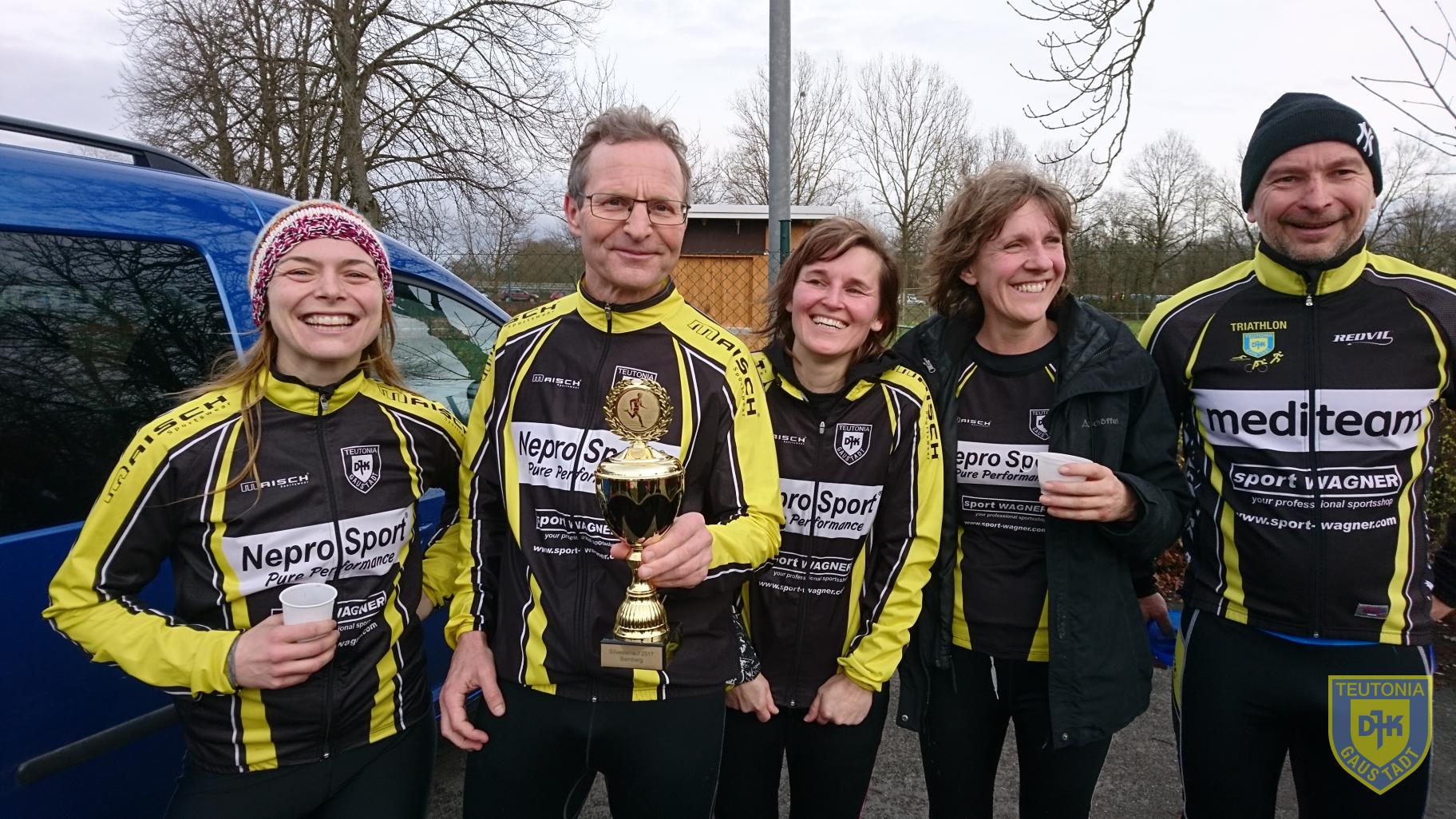 Zum Abschluss der Laufsaison 2017 nahmen wir dieses Jahr am Silvesterlauf der LG Bamberg im Hain teil. Ohne Zeitmessung konnte jeder nach Lust und Laune die drei Kilometer lange Runde zwischen ein und sechs mal laufen. Bei Temperaturen deutlich im plus verwandelte der getaute Schnee der letzten Tage die Strecke im Hain in eine schlammige Piste. Nach dem Lauf konnten sich die Teilnehmer im Vereinsheim der TSG 05 Bamberg ihre Teilnehmerurkunde abholen. Fast schon traditionell konnten wir auch wieder den Pokal für den teilnehmerstärksten Verein mit nach Hause nehmen. Im Anschluss an die sportliche Herausforderung konnten wir noch bei Glühwein, Punsch und süßen Leckereien an der DJK-Verpflegungsstelle (der Kofferraum von Karls und Ursels Auto) in lockerer Atmosphäre das Jahr Revue passieren lassen. An dieser Stelle noch einmal vielen Dank an die lieben Spenderinnen und Spender der diversen Leckereien. Insgesamt gesehen wieder ein tolles Event, das Lust auf die neue Saison 2018 macht.