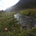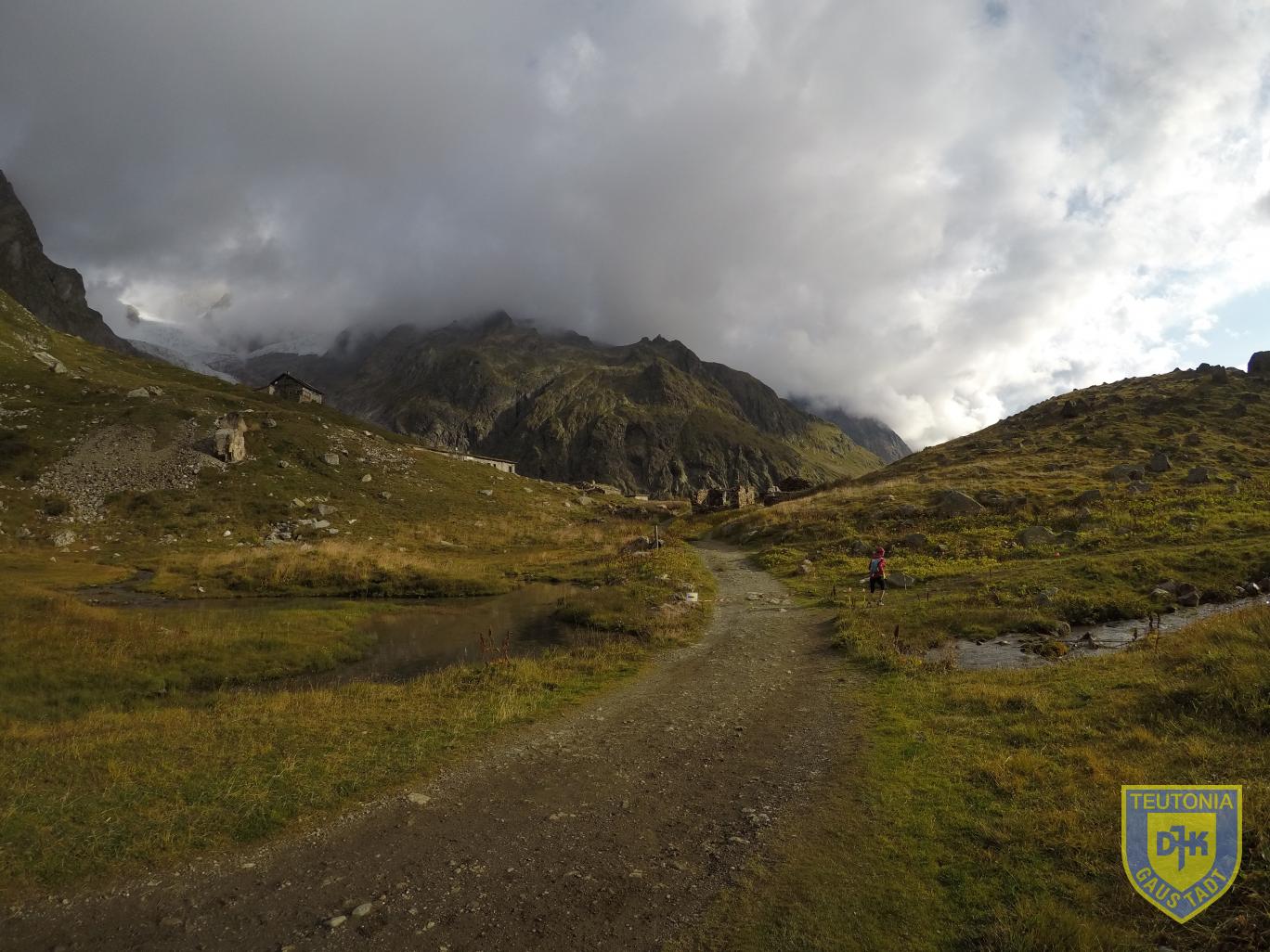 Weiter gings zum Col Checrouit (1956 Hm) 11.24 Uhr. Dann zur Wechselzone nach Courmanyeur (1210 Hm) 12.29 Uhr, Kleiderbeutel geholt und nach raschem umziehen, 2 Stücken Schokolade und etwas Nudelsuppe saß mir die Cut off Zeit schon wieder im Genick, das bedeutete, wenn ich bis 13 Uhr nicht startete, bin ich raus aus dem Rennen. Also weiter nach Refuge Betone (1991 Hm) 14.40 Uhr, Refuge Bonatti (2025 Hm) 16.35 Hm. Dann runter nach Arnouvaz (1769 Hm) 18.17 Uhr. In Arnouvaz angekommen trafen die Läufer sich alle in einem beheizten Zelt und es regnete in Strömen.