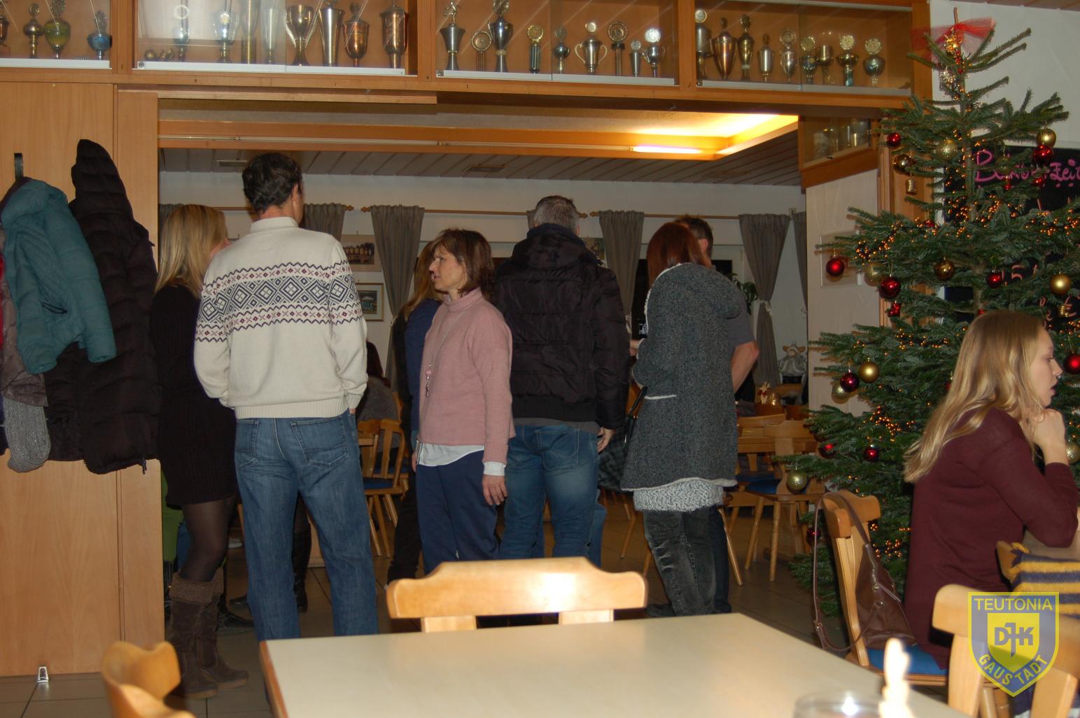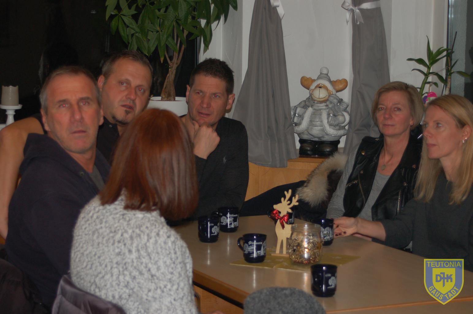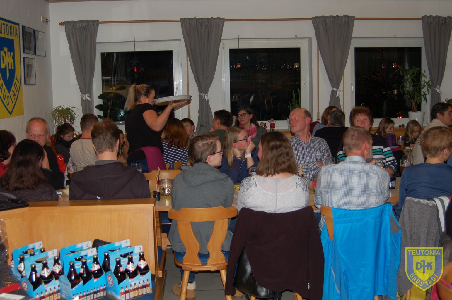 Der Platz im Vereinsheim reichte in diesem Jahr gerade noch aus, um die zahlreich erschienenen Triathletinnen und Triathleten samt ihren Familienangehörigen aufzunehmen. Die Weihnachtsfeier begann gegen 18 Uhr mit einem Glühweinumtrunk, natürlich auch ohne Alkohol.