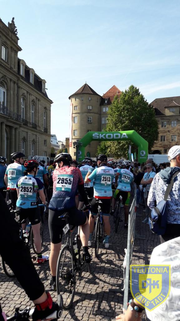Dann war es soweit, es ging endlich los. Direkt durch die gesperrte Innenstadt von Stuttgart ging es raus Richtung Osten. Der Flache Kurs und das Fahren in einer größeren Gruppe ermöglichte eine irre Geschwindigkeit, 45 km/h waren locker drin, teilweise trat ich sogar über 50 km/h ohne größere Anstrengung. Aber mir war schon klar, dass das nicht ewig so weiter gehen würde, schließlich warteten ja noch rund 1300 Höhenmeter auf mich. Einfahrt in einen zweispurigen Tunnel, das einzige was man hörte war das irre Summen und Surren hunderter Laufräder auf dem Asphalt, Gänsehaut-Moment. Nach knapp 25 km dann die erste Steigung, die aber dann gefühlt auch schnell bewältigt war. Ich hatte mir die Strecke zwar mehrfach angeschaut und wusste auch, wo ich langfahren würde, aber während des gesamten Rennens hatte ich nur in wenigen Momenten wirklich eine Ahnung, wo ich jetzt genau war. Der Tunnelblick und der Rausch waren größer als gedacht. Durch Kirchheim unter Teck hindurch ging es dann weiter Richtung Norden durch das Nassachtal Richtung Schorndorf. Ziemlich langgezogene Steigung, bei der es auch über den höchsten Punkt der Tour ging. Bei der Abfahrt passierte es dann doch: An einer Kreuzung innerorts hab ich mich arg verschätz mit der Geschwindigkeit und bin dann nur noch scharf bremsend geradeaus gefahren. Glücklicherweise war die Straße hier nicht zu Ende und ich kam mit einem leichten Schrecken davon. Die Kette nach der Abfahrt fast ganz rechts dauerte es einige Momente, bis ich wieder in den Tritt gekommen bin. Kurzer Blick auf die Uhr: bereits 80 km in den Beinen. Ab diesem Moment ging der Kampf mit mir selbst los. Ich zählte jeden einzelnen Kilometer. Nach etwa 90 km wurde es dann richtig hart: Für eine Autobahnüberführung ging ich kurz aus dem Sattel und wollte im Wiegetritt hoch, als ich merkte, dass meine Oberschenkel begannen, zuzumachen. Na super, ich hatte immer noch im Hinterkopf, dass mich der Pragsattel auf den letzten Kilometern erwarten würde. Mit ordentlich Kraft zu treten war also nicht mehr drin. 25 km vor dem Ziel zeigte die Straßenbeschilderung Stuttgart nach links, Ludwigsburg nach rechts. Und das gesamte Fahrerfeld bog nach rechts ab! Mittlerweile schmerzten die Beine auch beim normalen Treten. Irgendwann kam jedoch das Ortsschild von Stuttgart und ich versuchte so gut es geht mit zu schwimmen. Immer wieder überholten mich „Züge“, ich hatte aber nicht ansatzweise das Gefühl, hier aufspringen zu können. Ich kam mir vor wie in einer alten rostigen Draisine. Für den Bruchteil einer Sekunde überlegte ich, kurz abzusteigen und mich an den Straßenrand zu legen. Aber der Gedanke verschwand schnell wieder. Weiter geht’s, nur noch wenige Kilometer! Und dann kam er, der Pragsattel! Ein gefühlt 25 % nicht enden wollender Anstieg. Irgendwann muss es doch bergab gehen? Entschädigt wurden die Teilnehmer für eine schöne Aussicht von oben auf die Stuttgarter Innenstadt, für die ich in diesem Moment aber weiß Gott keinen Blick hatte. Die letzten Kilometer. Es ging bergab, vorbei an der Universitätsbibliothek, mein Arbeitsplatz. Dann konnte es ja nicht mehr weit sein. Die Schilder kündigten es an, nur noch 500 Meter. Einige Fahrer um mich herum setzten zum Zielsprint an. Für mich überhaupt nicht dran zu denken, ich überlege mir, wie ich vom Rad kommen soll ohne zu krampfen. Vielleicht einfach seitlich an die Bande fallen lassen. Die letzten Meter, die Zuschauer stehen entlang der Strecke und machen ordentlich Krach, Sandra ruft mich und winkt mir zu. Schließich die Ziellinie: Geschafft, nach 3:41 h war die 117,5 km lange Strecke bezwungen. Die ca. 500 Meter lange Ausrollzone brauche ich nur wenige Meter, nichts geht mehr. Absteigen ging dann überraschender Weise doch ganz gut. Nach dem Empfang der wohlverdienten Medaille wollte ich mich nur noch hinlegen. Was für eine Erfahrung, ich gestehe mir ein, die Sache vielleicht doch ein klitzeklein wenig unterschätzt zu haben. Sandra findet mich und versorgt mich mit einem alkoholfreien Weizen. Der Schmerz lässt nach und nach ein paar Minuten kann ich wieder einigermaßen gehen.