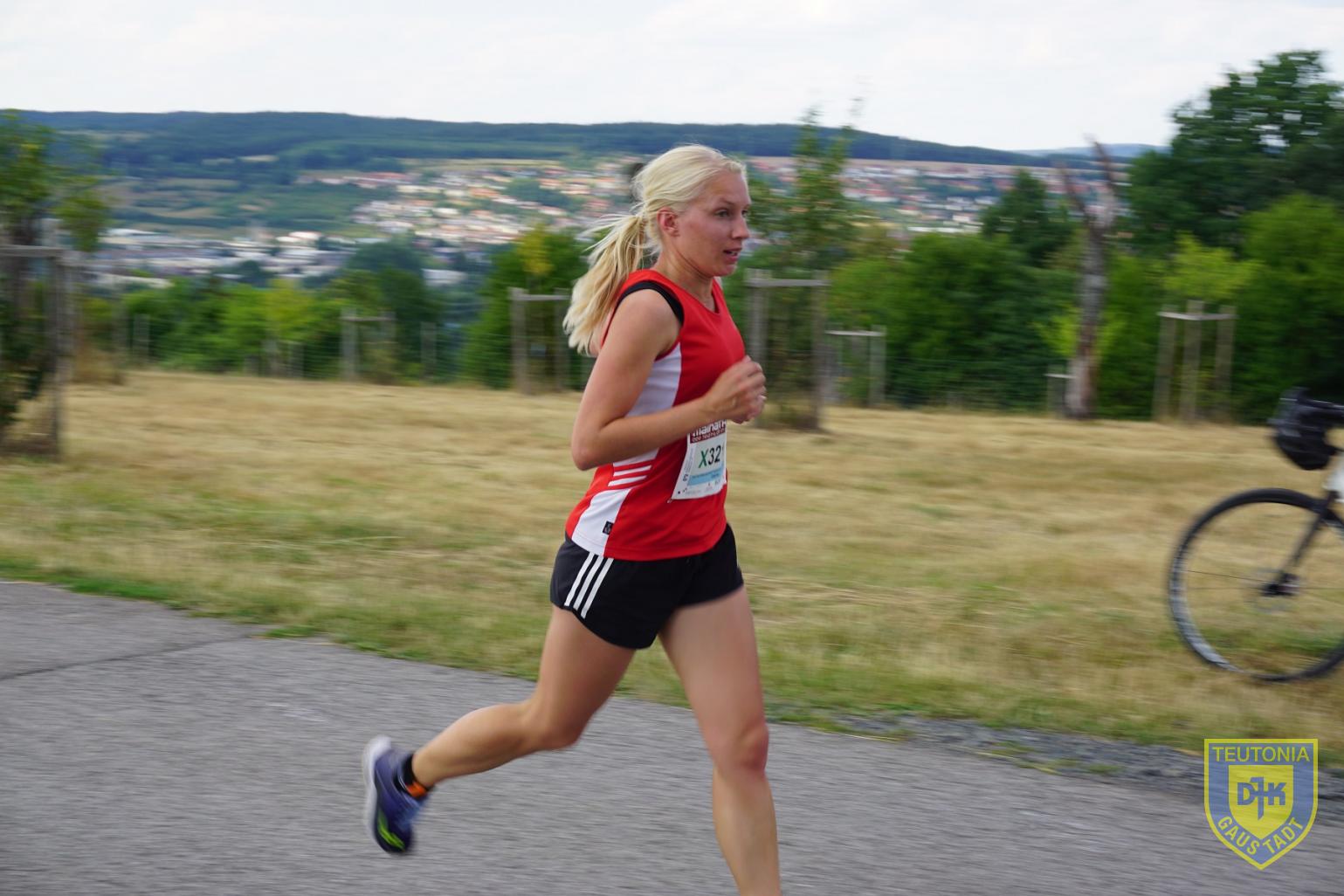 An erster Stelle liegend übernahm Carina den Transponder und startete auf die 7,3 km lange anspruchsvolle Laufstrecke. Der Anstieg zur Wallburg ist auf der Laufstrecke die größte Herausforderung und die warmen Temperaturen machten es nicht einfacher. Carina wechselte zwischen den Treppenstufen und dem Trampelpfad daneben hin und her. Nachdem sie die Burg umrundet hatte, ging es über Feldwege und durch das Neubaugebiet von Eltmann erstmal bergab. Carina konnte sich etwas treiben lassen und das Laufen fiel ihr hier sehr leicht. Wie auch vor zwei Jahren standen viele Hausbesucher mit Rasensprengern am Straßenrand und boten den Läufern eine Abkühlung. Auch sonst waren wieder sehr viele Zuschauer an der Strecke oder feuerten die Sportler vom Balkon oder Fenster aus an. Die letzten zwei Kilometer verliefen parallel zum Main entlang und hier musste sie ein wenig kämpfen, um das Tempo zu halten. Beim Einlauf ins Stadion wurde sie aber dann nochmal richtig von den Zuschauern "getragen" und im Ziel gebührend von Uli und mir empfangen. Nach 1:35:59 lief Carina ins Ziel. Den Streckenrekord von 2016 hatten wir um über eine Minute verbessert.