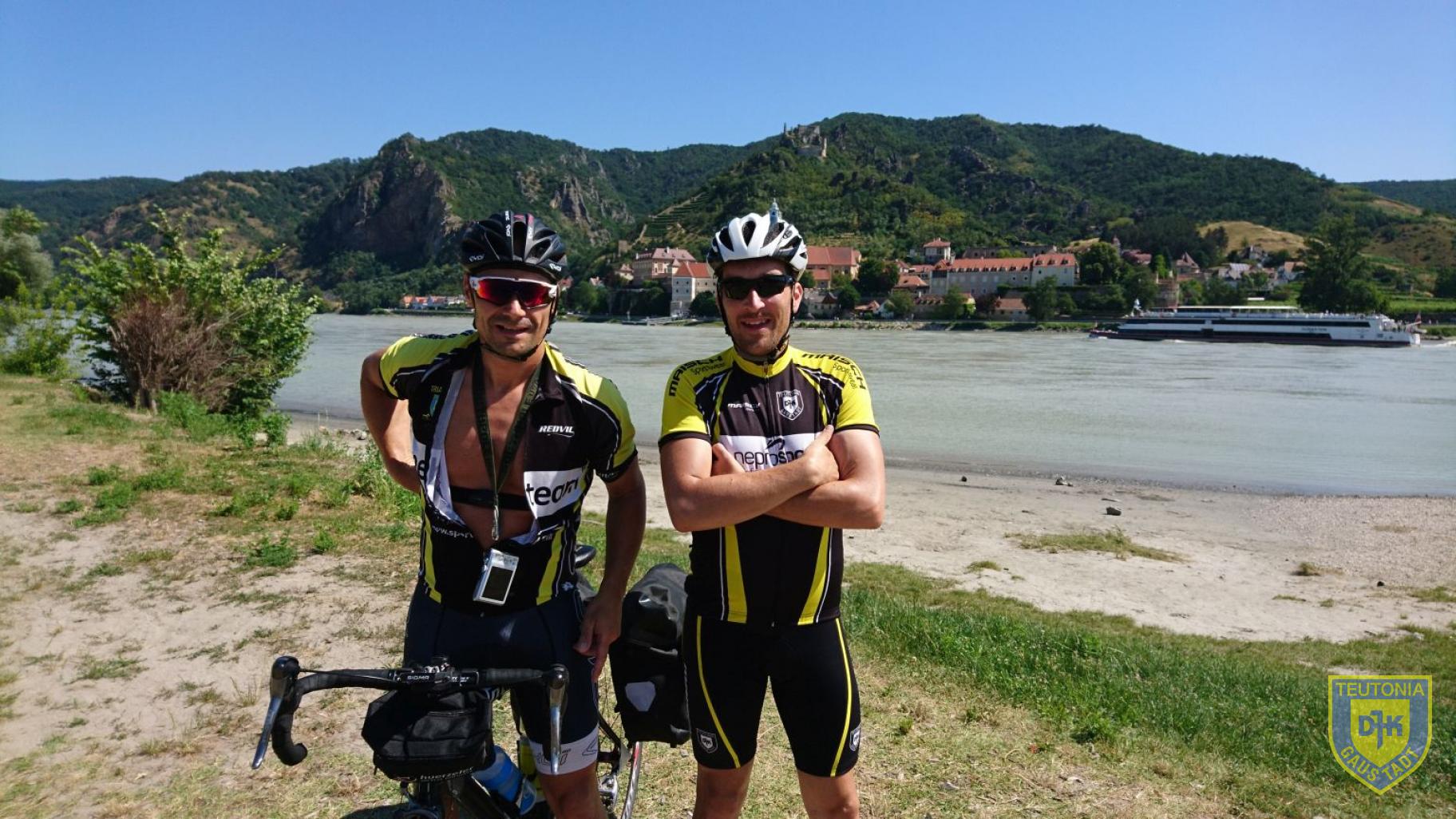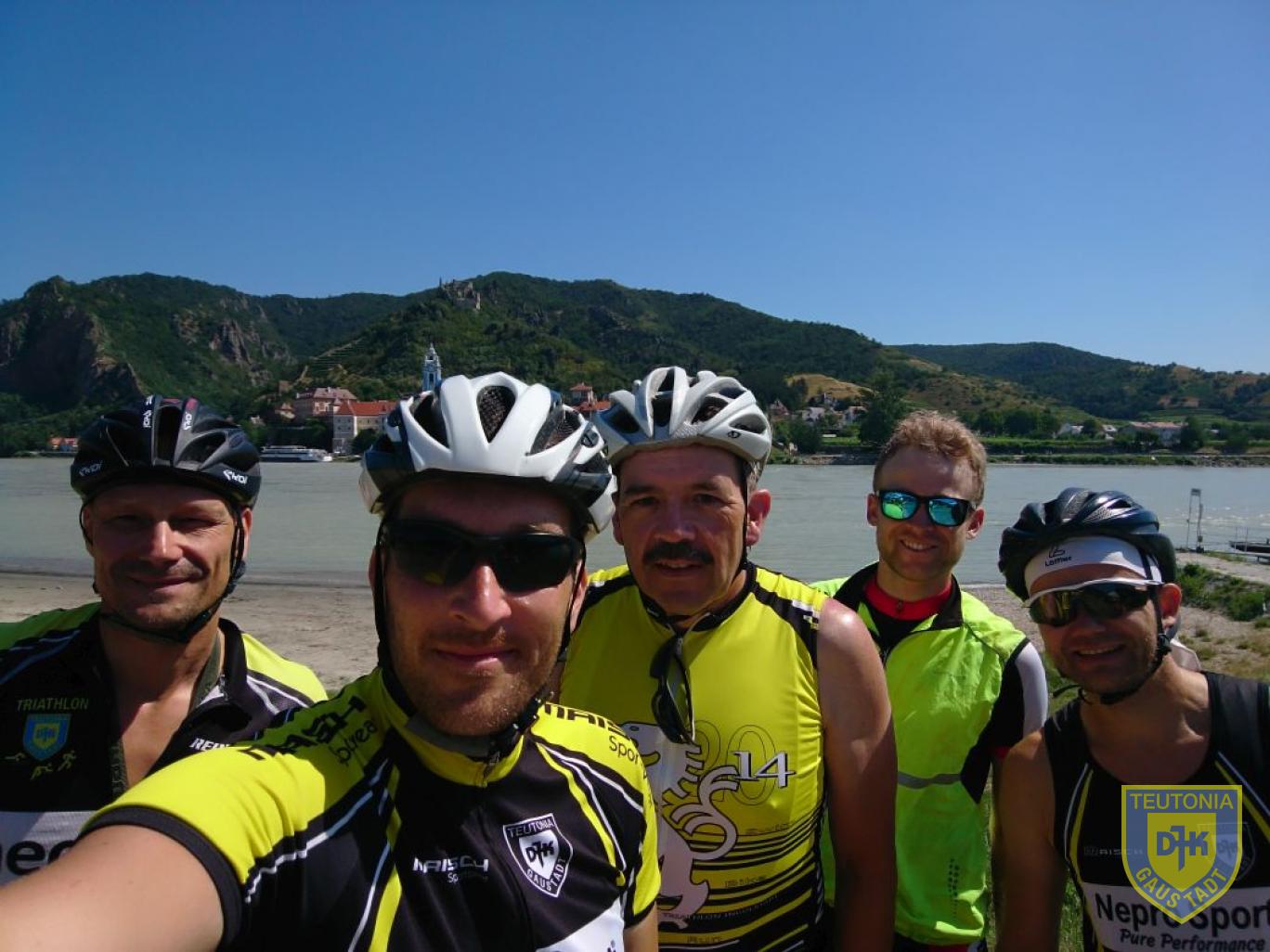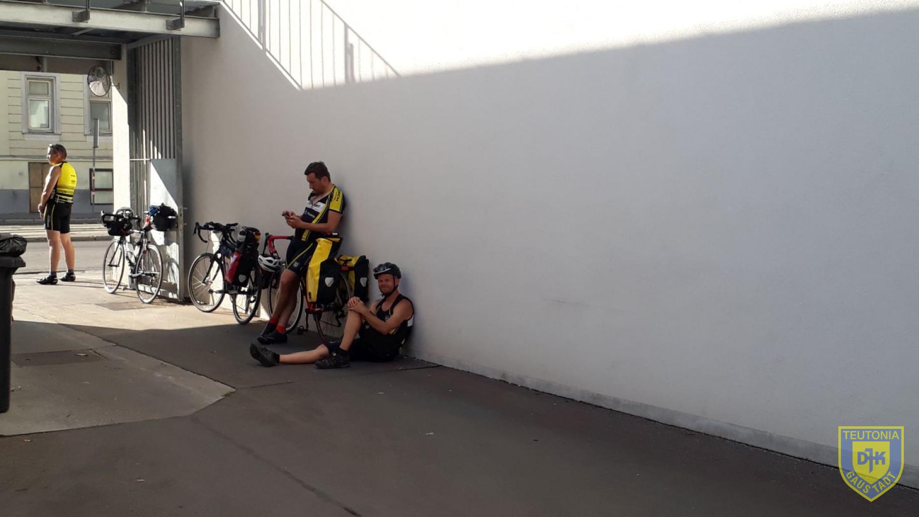 Das große Ziel naht: die letzte größere Etappe, die es mit Gepäck zu fahren galt, startete gegen halb zehn am Marillenhof in Melk. Als Vorbereitung genossen wir wieder ein hervorragendes Frühstück mit selbstgebackenen Brötchen. Die ersten Kilometer rollte der DJK-Express mit Tender wieder entlang des Donauradweges. Nach knapp einer Stunde Fahrt nährten wir uns Dürnstein. Am Nordufer gelegen thront über der Stadt die einst mächtige Burg Dürnstein, heute nur noch eine Ruine, erbaut Mitte des 12. Jahrhunderts. Ein kurzer Stopp mit obligatorischem Foto erfolgte. Jedoch anders als Richard Löwenherz wurden wir nicht zu unfreiwilligen Gästen. Herzog Leopold V. bzw. Hadmar II. hielten den Englischen König auf seiner Rückkehr vom Dritten Kreuzzug dort gefangen und lieferten diesen später an Kaiser Heinrich VI. aus. Eine Festungshaft blieb uns allerdings glücklicherweise erspart. Nach einer kurzen Hast, bei der Jens und Ole vom DJK-Tross abrissen, kehrten wir zum Mittag in die Bärndorferhütte am Fuße des Atomkraftwerkes Zwentendorf ein. Das AKW wird als die größte Investitionsruine Österreichs bezeichnet, denn es ging tatsächlich nie in Betrieb. Somit mussten wir uns auch keine Sorgen machen und konnten entspannt das Essen genießen. Die Kilometer flogen weiter an uns vorbei, bis wir nach knapp 110 Kilometer einen letzten Stopp kurz vor Wien einlegten. Wir verabschiedeten uns bereits von unserem Begleiter, der am selben Tag noch ein paar Kilometer fahren wollte. Von Norden her rollten wir dann nach Wien ein, ohne direkt zu wissen, dass wir bereits da waren. Es fehlte das Ortsschild auf dem Radweg, so dass wir bereits mitten in Wien zum Halten kamen. Die nun endgültige Verabschiedung von Ole war dann doch irgendwie merkwürdig, hatte er uns doch jetzt fast 3 Tage und 300 km begleitet. Aber Wege trennen sich und Bamberger wissen es: Man sieht sich immer zweimal. Zur Überbrückung der Schlüsselübergabe der Unterkunft genossen Christian, Michael und Ralf einen kurzen Sprung in die Donau, während Jens bei den Fahrrädern ein wenig döste. Eine Zwei-Zimmer-Wohnung im sechsten Stock mitten in der Wiener Donaustadt diente als Unterkunft, die Räder parkten auf den zwei angeschlossenen Balkonen. Getreu Reinhard Fendrichs Hit „Haben sie Wien schon bei Nacht gesehen, haben sie das schon erlebt?“ war der Plan für den Abend geschmiedet: Essen im nahegelegenen Donau Zentrum und danach mit der U-Bahn zum Stephansplatz. Ein kurzer Rundgang durch die Wiener Innenstadt, vorbei am Stephansdom, der Wiener Hofburg sowie der Österreichischen Nationalbibliothek zur Albertina endete dann mit einem Radler aus der Dose auf einer Parkbank mitten in der Wiener Innenstadt, durchaus stilvoll.