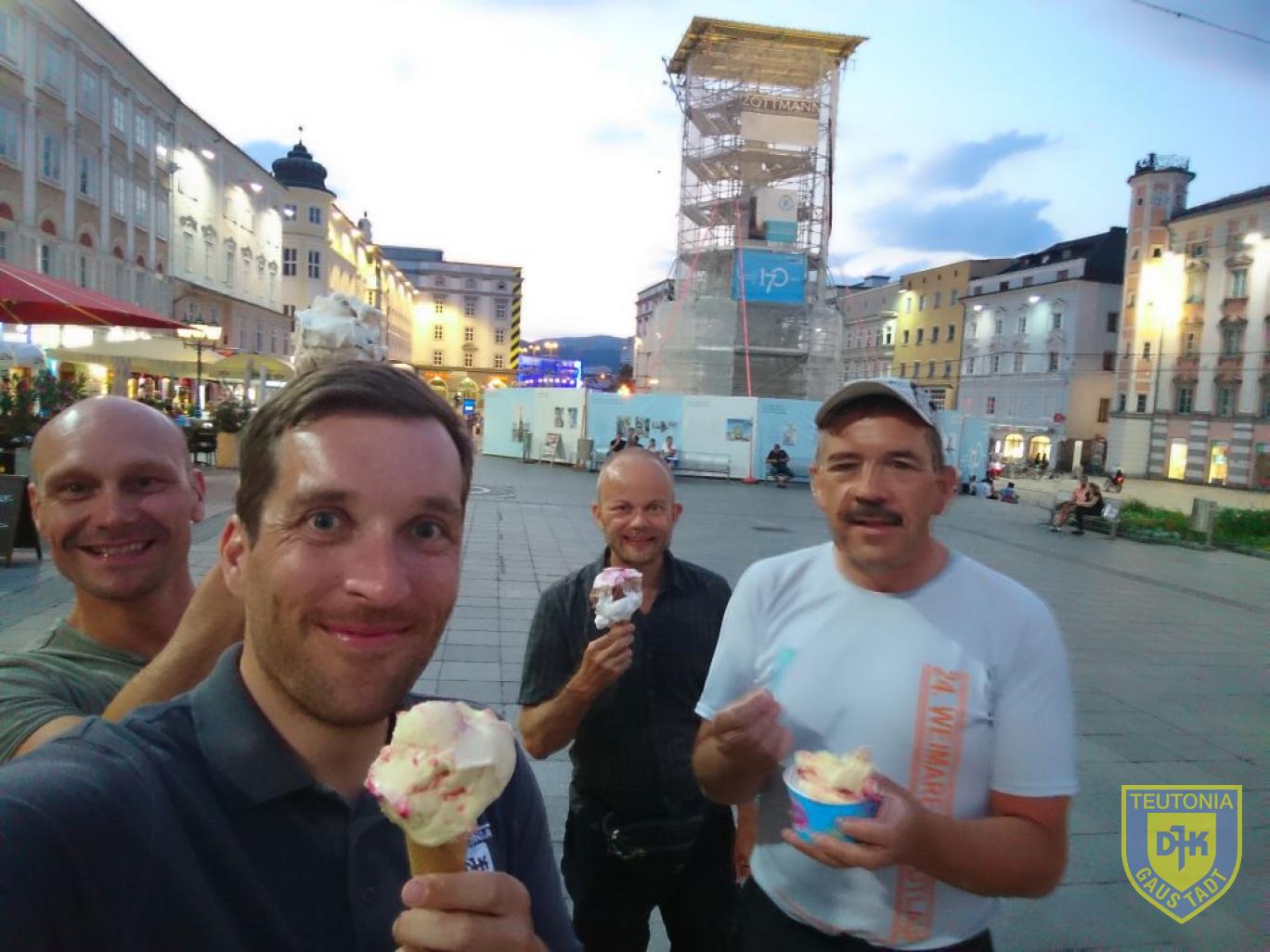 Nach einer erholsamen Nacht genossen wir in aller Gemütlichkeit das nicht ganz so umfangreiche aber trotzdem gute Frühstück und machten uns für die dritte Etappe bereit. Wie verabredet trafen wir Ole an unserem Hotel gegen halb zehn und rollten los. Heute ging es nach Melk. Auch heute wieder der erste Stopp nach nur 20 km. Wir verließen den Donauradweg in Richtung Norden. Eine kleine Anhöhe stelle sich uns in den Weg, die zwar kurz war, uns aber mit rund 14 % Steigung einige physische Kräfte abverlangte. Oben angekommen türmten sich die Mauern eines Reliktes aus dunklen Zeiten auf: Die KZ-Gedenkstätte Mauthausen. Der Besuch in der recht gut erhaltenen Anlage nagte auch ein wenig an den psychischen Kräften. Unvorstellbar aus unserer heutigen Sicht, was Menschen hier anderen Menschen vor mehr als 70 Jahren angetan haben. Ein Moment des Innehaltens, der uns weit weg katapultierte. Ein Schwarm Schwalben kreist immer wieder über die Mauern und die Türme hinweg. Einmal ein Vogel sein, wie viele Mensch an dieser Stelle diesen Gedanken wohl schon hatten? Irgendwann sind wir dann weiter, weg von diesem Ort, wieder runter an die blaue Donau. Der bisher eher leere Radweg wurde von jetzt an stetig voller, die Symphonie von vier Fahrradglocken gepaart mit dem Ausruf „rechts fahren!“ wurde zum Dauerbegleiter im Ohr der vier Teutonen. Kurze Mittagsrast in Grein nach ca. 60 km. Irgendwann tauchte dann von Weitem die Silhouette des Stifts Melk auf. Als Handlungsort in Umberto Eccos Roman „Im Namen der Rose“ weltberühmt und durchaus eindrucksvoll bereits von weitem. Auf dem Marktplatz in Melk angekommen trennten sich erneut die Wege zwischen uns und unseres Begleiters Ole. Wir verabredeten uns wieder, die morgige Etappe nach Wien gemeinsam zu fahren. Die Unterkunft lag nicht weit weg vom Donauradweg oberhalb von Melk. Nach einer kurzen und erfrischenden Dusche gingen wir runter in die Innenstadt. Die Hitze des späten Nachmittags begleitet uns auf dem Weg zum Stift Melk, ein beeindruckender Barock-Bau, der zum UNESCO-Welterbe gehört. Ein kurzer Streifzug noch durch den Stift-Garten, bevor die knurrenden Mägen uns zum Essen am Marktplatz überredeten. Es folgte das Übliche Prozedere der Verwirrung: Michael bestellte doppelt, Christian und Jens bestellten abwechselnd das Getränk, das der andere vorher hatte und so war die Bedienung wieder leicht sichtbar irritiert. Zum Ende gab es noch ein Eis auf dem Marktplatz mit bestem Blick auf das Stift und noch einen Absacker.
