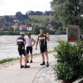 Es hatte die Nacht durchgeregnet und das Geräusch von leichtem Nieselregen am Morgen drang durch das geöffnete Fenster in den dritten Stock unserer Unterkunft. Gegen halb acht ging es runter zum gemeinsamen Frühstück. Beim Frühstücksbuffet blieb kein Wunsch offen und so ging es mit guter Stimmung weiter zur zweiten Etappe. Das knapp 125 km entfernte Linz war das nächste Ziel. Gegen 09:00 Uhr rollte der DJK-Zug an und auch der Regen hatten mittlerweile aufgehört. Bereits nach 25 km die erste kurze Pause mit obligatorischem Fototermin am Zusammenfluss der Inn, Ilz und Donau mit anschließendem Kaffee-Stopp in der Innenstadt. Wir sind mittlerweile in Passau und nach kurzem Aufenthalt ging es weiter. Die Grenzüberschreitung geschah vollkommen unwissentlich, nur an den Ortsschildern war zu erkennen, dass wir uns bereits in Österreich befinden mussten. Der Radweg hier glich einer Autobahn und lud gerade zu ein schnell zufahren. Noch vor dem Mittag machten wir dann unterwegs eine Bekanntschaft, die uns bis zum Ende der Tour erhalten bleiben sollte. Ein Rennradfahrer mit Anhänger fuhr uns voraus, offensichtlich auch recht flott unterwegs, so dass wir nicht ganz so einfach aufschließen konnten, wie mancher gedacht hatte. Mit seinem kleinen Rückspiegel hatte er uns (wie er uns später gestand und aufgrund dessen wesentlich schneller fuhr als sonst) bereits gesehen. Beim Überholen kurzer musternder Blick und weiter, nur Ralf kam kurz mit ihm ins Gespräch. Ebenfalls unterwegs nach Linz und so war der Mitfahrer gefunden. Bei der ersten Pause kamen wir dann etwas mehr ins Gespräch. Ole, 27 Jahre und Psychologie-Student aus Norwegen war doch tatsächlich mit dem Rad auf dem EuroVelo 6 unterwegs, vom Atlantik ans Schwarze Meer. Wir teilten unser Essen mit Ole und fuhren von jetzt an gemeinsam. Weiter ging es nördlich der Donau bis zur Schlögener Schlinge. Hier mussten wir das einzige mal eine Fähre nehmen, da der Radweg im Norden einfach zu Ende ging, so jedenfalls die Aussage des Fährmanns. Eine sehr schöne Unterbrechung. Nur wenige Minuten dauerte das Übersetzen und es ging gleich mit vollem Elan weiter. Gegen 16:00 Uhr erreichten wir gemeinsam Linz und unsere Wege trennten sich zunächst. Unsere Unterkunft befand sich in unmittelbarer Nähe zum Donauradweg, Ole übernachtete in der südlichen Linzer Innenstadt. Wir hatten das gleiche Etappenziel am nächsten Tag und beschlossen gemeinsam weiter zu fahren. Im Hotel angekommen die ersehnte Dusche. Auf dem Abendprogramm stand ein Besuch am naheliegenden Badesee mit anschließender Verköstigung dort. Ein obligatorischer Abstecher in die Linzer Innenstadt beendete den zweiten Tag der Tour. Das klimatisierte Hotel bescherte eine angenehme Nacht.