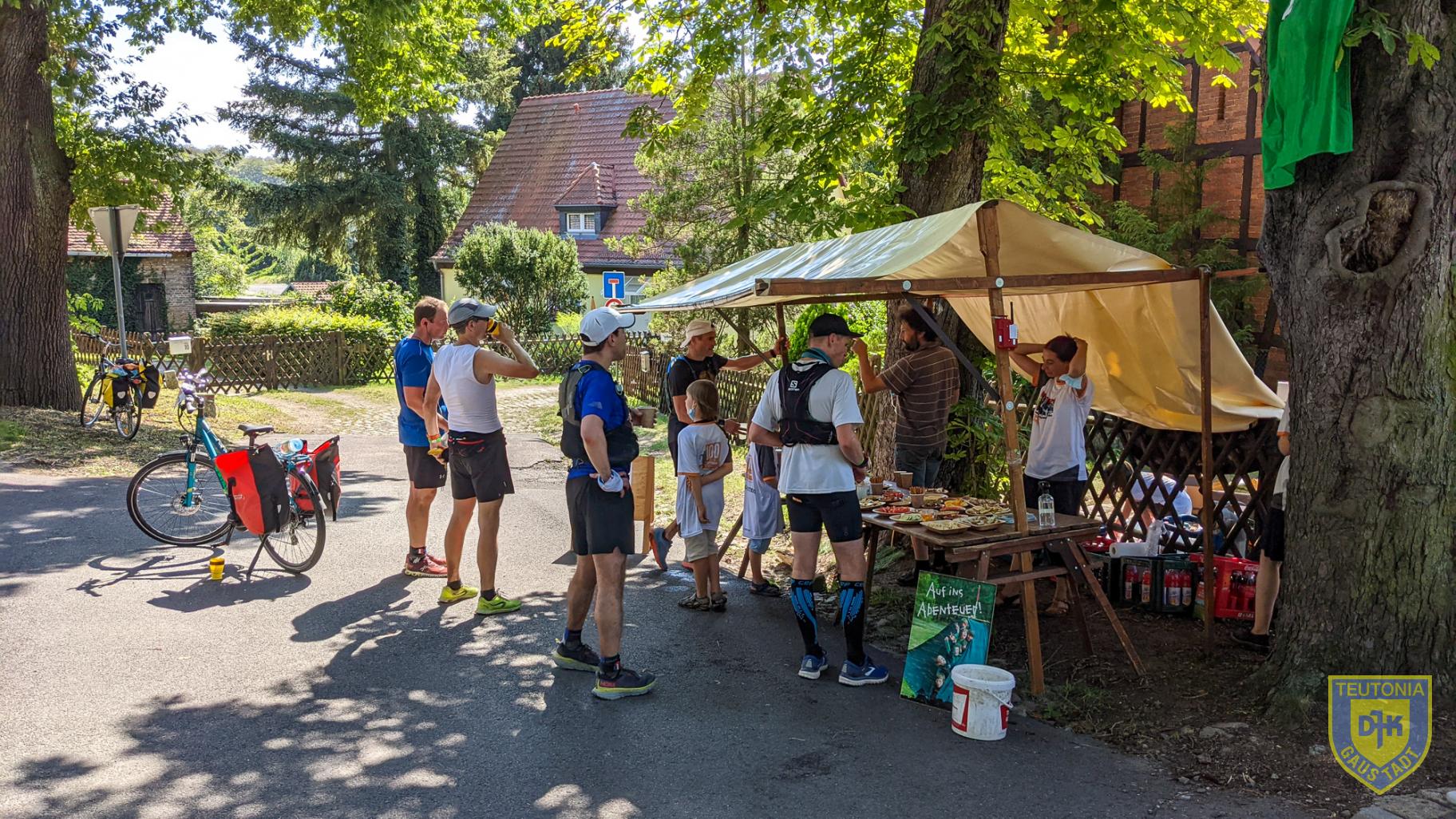 An der Versorgungsstation Falkenseer Chaussee bei Kilometer 110 spürte ich, dass die Anstrengungen der letzten Stunden, aber es ging noch relativ gut. Durch den Spandauer Forst liefen wir nach Schönwalde. Schön langsam wurde es etwas dunkler und die Luft kühlte ab. Es war sehr angenehm zu laufen, wobei mein Tempo langsamer wurde. Es wurde anstrengender… An der Havel entlang liefen wir nach Nieder Neuendorf, wo direkt am ehemaligen Grenzturm eine weitere Versorgungsstation aufgebaut war. 123 Kilometer war ich inzwischen gelaufen, 15:12 Stunden unterwegs und auf Platz 4 in meiner AK.
