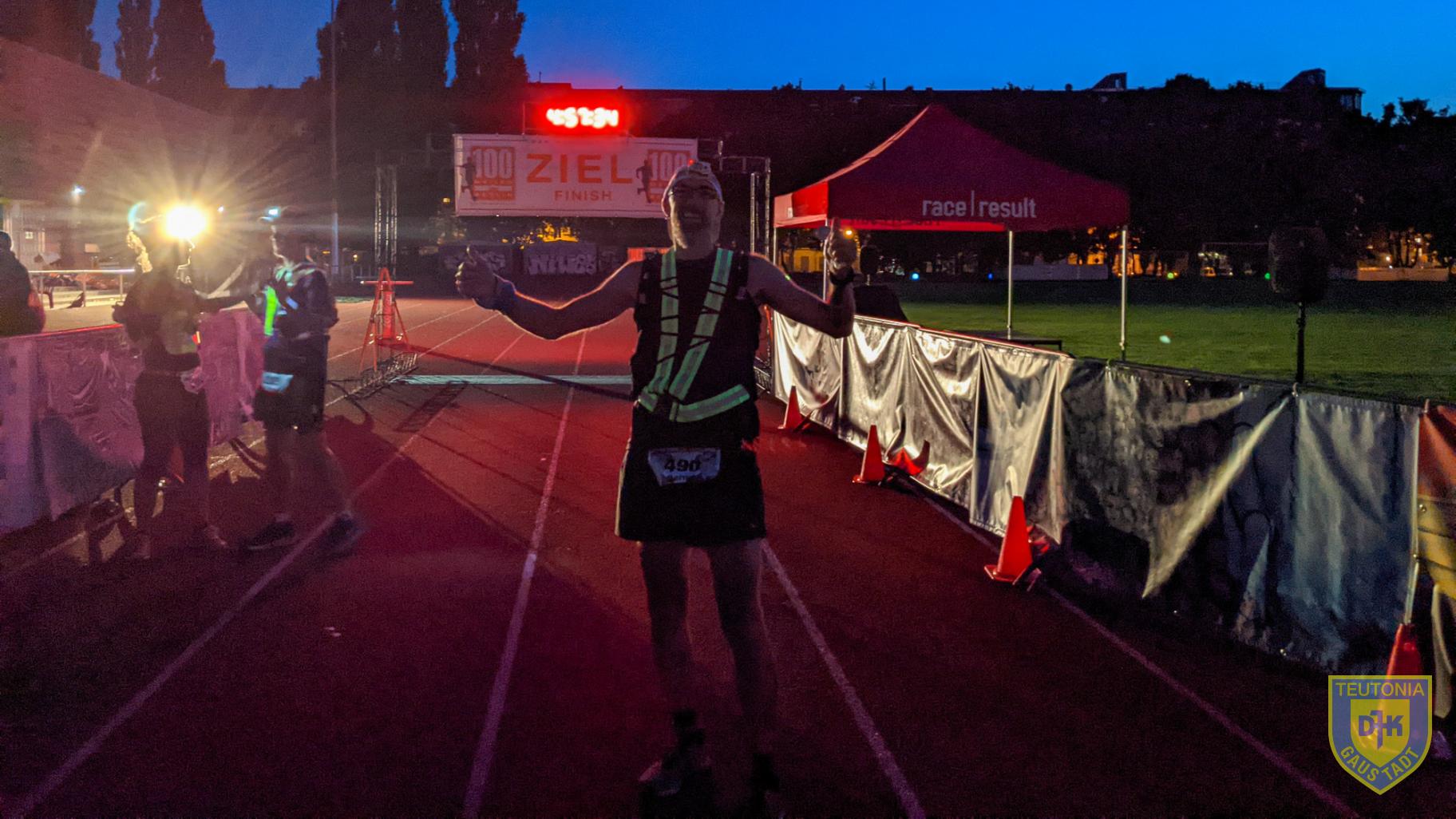 Noch ein letzter Park mit einer Pause auf einer Parkbank, bevor die letzten Kilometer anstehen. Ich gehe an den Versorgungsstationen vorbei, will ins Ziel! Nahe der Bornholmer Straße queren wir die Bahngleise, laufen an der Station vorbei und über den Schwedter Steg in die Schwedter Straße. Nach einem kurzen Stück durch den Mauerpark und vorbei an der Max-Schmeling-Halle schwenken wir auf eine letzte Ehrenrunde im Friedrich-Ludwig-Jahn-Sportpark ein. Die Bahn ist bunt beleuchtet und ich nehme nochmal alle Kraft zusammen. Ich will laufend über die Ziellinie. Es gelingt mir auch und nach 22:56:39 Stunden erreiche ich als 106. Einzelstarter bzw. Einzelstarterin das Ziel! Ich habe es geschafft. Mein erster 100 Meilen Lauf ist geschafft!