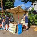 Pünktlich um 6 Uhr morgens fällt der Startschuss und die Läuferinnen und Läufer verlassen nach einer Ehrenrunde das Stadion und biegen auf die Bernauer Straße ein. Die Strecke führt uns entlang der Mauer und an der Gedenkstätte Berliner Mauer vorbei. Nach ein paar Abzweigungen erreichen wir den ehemaligen Grenzturm mit der Gendenkstätte Günter Litfin, der am 24. August 1961 an der Mauer starb. Vorbei am Hauptbahnhof, Reichstag und Brandenburger Torlaufen wir zum Checkpoint Charlie, wo nach knapp 9 km die erste Versorgungsstation aufgebaut ist.