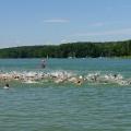 Nachdem der Start um 15 Minuten nach hinten verschoben wurde, die Teilnehmer der Olympischen Distanz wurden vorgezogen, ging es um 11.35 Uhr in das 20,6° kalte Wasser. Das Starterfeld trug auf der gut 700m langen Schwimmstrecke nur teilweise einen Neoprenanzug. Da das Ausziehen mehr Zeit in der Wechselzone braucht entschied ich mich gegen die „Pelle“. Nach der Erfrischung im Wasser ging es auf Radsuche in der Wechselzone. Diese waren nicht nach Startnummern sortiert, sondern nach eigener Platzierung aufgereiht, getreu dem Motto: Wer zuerst kommt, bekommt den besten Platz. Etwas unglücklich gelöst war das Aufsteigen nach der üblichen Linie. Diese bestand aus einer Holzleiste, so dass man das Rad nicht darüber schieben, sondern heben musste.
