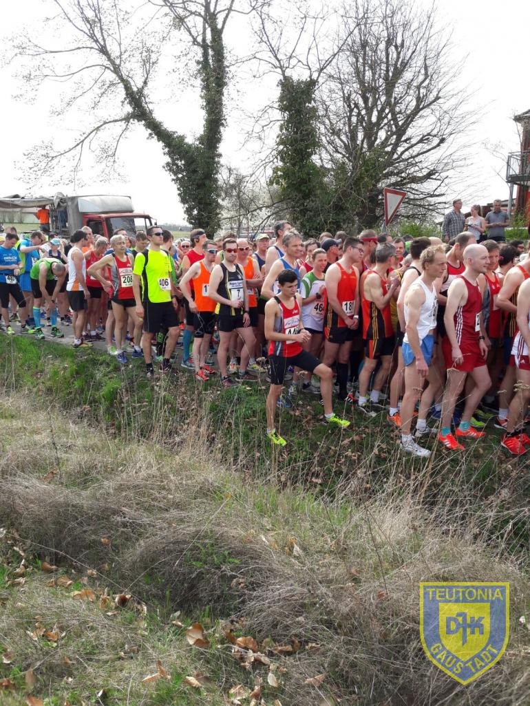 Zum Jubiläum ihres Straßenlaufes war der TSV Neuhaus 2017 auch der Ausrichter der Bayerischen Straßenlaufmeisterschaften, entsprechend hochkarätig besetzt war das Feld. Als einziger Teutonia machte ich mich auf und fand mich um kurz nach zwei in der Startaufstellung inmitten der Meisterschaftskandidaten. Das eigenartige Wetter versprach zu Beginn eigentlich beste Voraussetzungen zu bringen, aber 25°C sind für den 01. April einfach zu warm. Die Startaufstellung befand sich etwas entfernt vom Stadion des TSV Neuhaus auf einem Flurweg, rechts und links von einem kleinen Wassergraben gesäumt. Jeder wollte natürlich soweit wie möglich vorne sein, zählt bei Meisterschaften ausschließlich die Brutto-Zeit. So kam es, dass an den Außenrändern die Teilnehmer teilweise zwar nicht mit einem Bein im Knast, aber zumindest im Graben standen.
