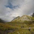 Weiter gings zum Col Checrouit (1956 Hm) 11.24 Uhr. Dann zur Wechselzone nach Courmanyeur (1210 Hm) 12.29 Uhr, Kleiderbeutel geholt und nach raschem umziehen, 2 Stücken Schokolade und etwas Nudelsuppe saß mir die Cut off Zeit schon wieder im Genick, das bedeutete, wenn ich bis 13 Uhr nicht startete, bin ich raus aus dem Rennen. Also weiter nach Refuge Betone (1991 Hm) 14.40 Uhr, Refuge Bonatti (2025 Hm) 16.35 Hm. Dann runter nach Arnouvaz (1769 Hm) 18.17 Uhr. In Arnouvaz angekommen trafen die Läufer sich alle in einem beheizten Zelt und es regnete in Strömen.
