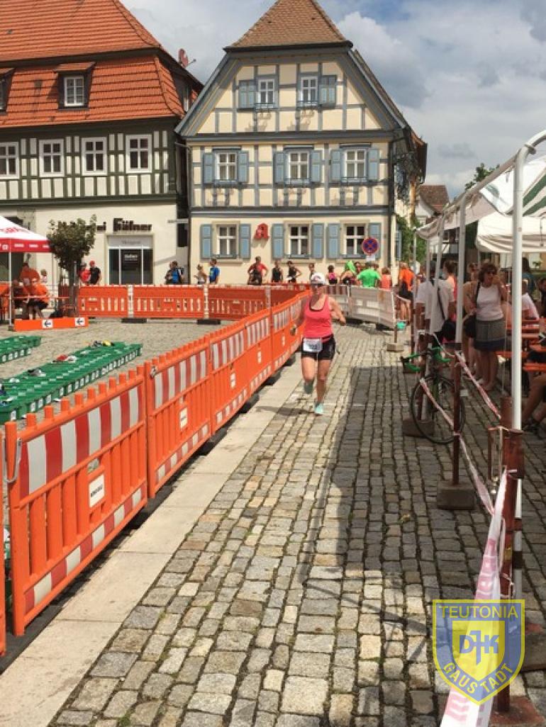 Als die 94,6km hinter mir lagen, kam endlich das Laufen, meine Lieblingsdisziplin. Auch hier wurde wieder ein Rundkurs, diesmal über 5,2km, viermal durchlaufen. Jetzt wurde es dann richtig heiß! Glücklicherweise war die Laufstrecke von vielen Versorgungstellen gesäumt, sodass man sich immer wieder mit Wasser, Iso, Cola und Schwämmen erfrischen konnte. Zudem gab es an mehreren Stellen Rasensprenger, die die Läufer abkühlten. Beim Laufen ging es von Hofheim nach Reckerthausen und wieder zurück nach Hofheim. Insgesamt eine schöne, sehr sonnige und flache Strecke. Beim Zieleinlauf wurde ich dann von Carlos überrascht, der mich freudig begrüßen wollte und mir vor den Füßen herumhüpfte. Endlich im Ziel angekommen, traf ich dann auch auf die anderen DJKler sowie meine Mutter und Gero, die mich beglückwünschten und mich auch den ganzen Wettkampf über auf der Schwimm-, Rad- und Laufstrecke stets angefeuert haben. Vielen vielen Dank nochmals für eure tolle Unterstützung J