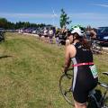 Aber angemeldet ist angemeldet. Am Wettkampftag reisten Sandra und ich mit gemischten Gefühlen an. Auch das Teilnehmerfeld sah recht professionell aus, außerdem war es noch die Vereinsmeisterschaft vom Post SV Nürnberg. Aber wir waren nun mal da und kneifen geht ja gar nicht. Also auf in den Bagersee. Das Schwimmen lief ganz gut, angenehme 22 Grad und durch den Start im hinteren Feld auch kein Wasserkampf. Nahezu zeitgleich kamen Sandra und ich aus dem Wasser, schnell umgezogen und aufs Rad. Tatsächlich, die Radstrecke verlief nur bergauf, manchmal richtige Berge und manchmal sehr subtil, man sah die Steigung nicht aber man merkte es. Aber es machte trotzdem Spaß. Kurz vor dem Ziel tatsächlich die angekündigte Steigung und was macht meine Schaltung – sie hakt und ich kann nicht mehr aufs kleine Blatt schalten – dann eben nicht. Oben angekommen funktionierte es wieder, Gott sei Dank, denn jetzt kam der letzte Berg kurz vor dem Ziel, aber auch geschafft.
