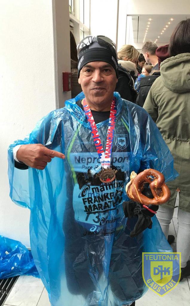 Frankfurt ist der einzige Marathon, bei dem der Mann mit dem Hammer schon zu Beginn kommt: Die Startaufstellung erfolgte direkt unter dem Kunstwerk „Hammergin Man“, einer 13,5 Meter hohen Skulptur. Die ersten Kilometer verliefen wie geplant, nur auf das GPS-Signal in den Häuserschluchten war kein Verlass. Ok, dann wird nach Puls gelaufen, kein Problem. Nach Kilometer 3 führte die Strecke parallel gegen die Strecke bei Kilometer 1. Ich habe mir etwas Luft beiseite gepackt, um William ordentlich anfeuern zu können, hab ihn aber leider doch nicht erspähen können. Die Runde um das Börsenviertel verlief ohne große Probleme, weiter ging es ab km 13,5 südlich des Mains Richtung Osten bis Schwanheim. Halbmarathonmarke erreicht. Gefühl: Eigentlich ganz ok, alles im Soll, nur der Wind machte mir etwas zu schaffen. Bei km 24 überquerten wir erneut den Main direkt Richtung Norden. Die schlimmste Stelle. Der Wind blies direkt von vorne ins Gesicht. Blieb nur eins: ab in den Windschatten der Läufer vor mir. Kurzer Schwenk durch Höchst, weiter durch Nied dann auf die Mainzer Landstraße. Mittlerweile sind 30 km erreicht und der Kopf fängt an, komische Sachen zu machen. 4 km schnurrgerade waren dann doch nicht so ohne. Besonders fies: bei km 35 ging es direkt durch die Europa-Allee vorbei am Hotel! Höchststrafe. Noch 7 km! Ab km 37 ging es dann über den Streckenteil, den wir schon zu Beginn gelaufen waren. So wirkliche Orientierung hatte ich allerdings nicht mehr, nur noch den Blick auf die km Beschilderung. Sehnsüchtig kämpfte ich mich von einer Verpflegungsstelle zur anderen, mich hatte der Durst so richtig gepackt. Die Ankündigungsschilder „Verpflegungsbeginn in 200 Meter“ waren gefühlt 2 km zu früh aufgestellt. Die Zahlen auf den km Angaben begannen dann irgendwann mit einer 4. Jetzt kann es doch nicht mehr weit sein. Km 41. In Sicht: Der Mann mit dem Hammer vom Start. Es geht Richtung Ziel. Der berühmte Einlauf in die Festhalle. Laute Musik ist zu hören, Zuschauer jubeln und das Zieltor direkt voraus. Nur noch durch und vorbei ist die Quälerei. Der Blick auf die Uhr zeigte am Ende, dass der Plan glücklicherweise aufgegangen ist. Die Pace nicht ganz so konstant wie gewollt, aber was solls. Ziel erreicht! Nach der (den Außentemperaturen geschuldeten) kurzen Plünderungstour der Zielverpflegung war mein nächstes und vorletztes Ziel der Meetingpoint, wo mich Sandra schon erwartete. Geschafft.