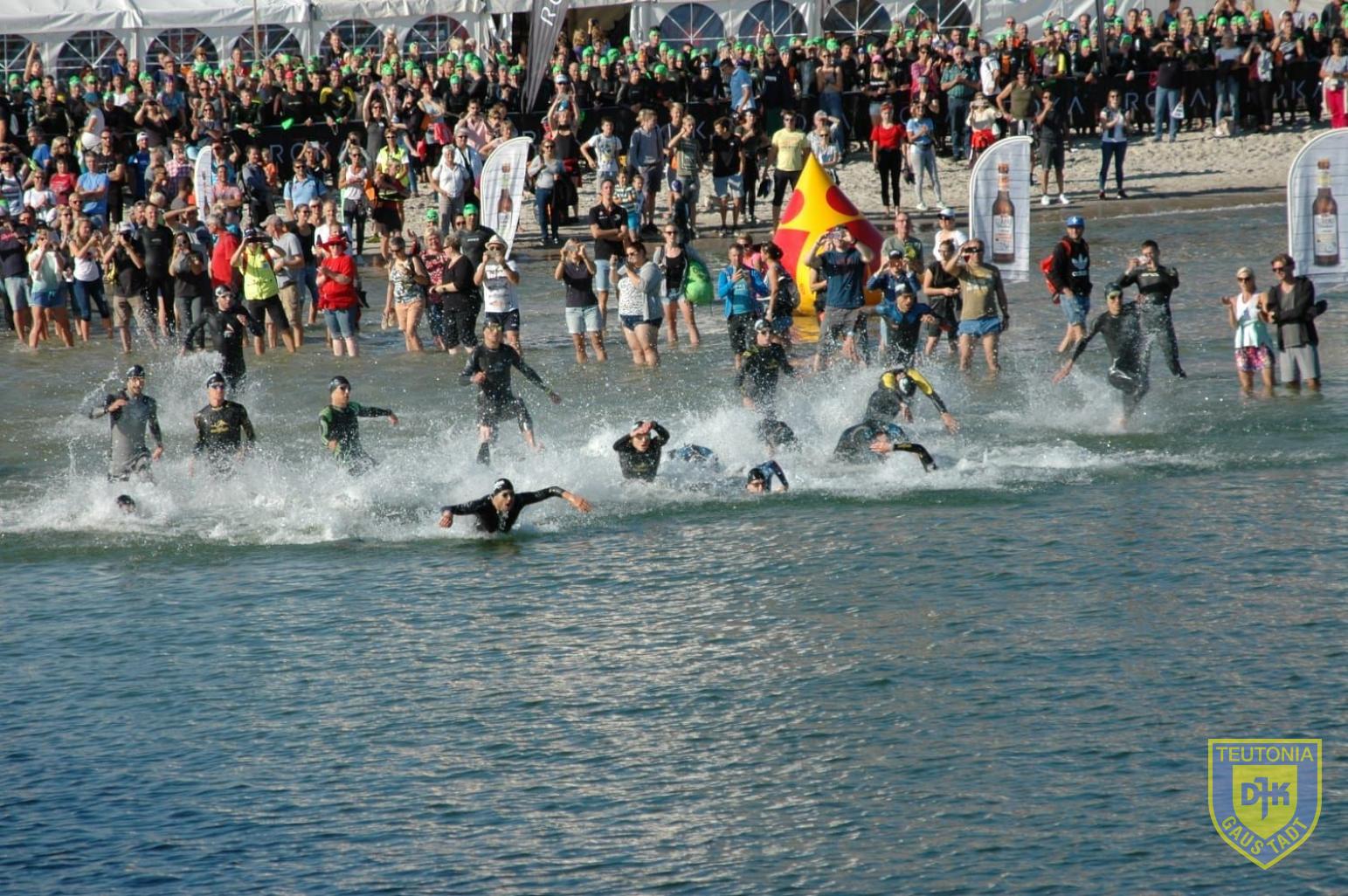 Wenn an so einem Tag die Sonne lacht und noch dazu das Meer ruhig bleibt kann das nur zu Bestzeiten führen. Da der Schwimmstart nach den Profis erst um 10.15 als Rolling Start erfolgte konnte man fast ausschlafen. Die Strecke war zwar gute 300m zu lang, aber das hatten alle und es fühlte sich an diesem Tag absolut rund an. Mit einer Pace von 1:33min auf 100m kam ich im Nachhinein quasi zeitgleich mit einer weiteren Athletin meine Altersklasse führend aus dem Wasser. Durch den Rolling Start war dies zu dem Zeitpunkt noch nicht einsichtig. In Binz wurden alle 6 Sekunden 4 Athleten ins offene Meer geschickt. Dadurch wird der Start entzerrt, man hat aber keine Übersicht zu den Zeiten anderer Athleten. Meine direkte Konkurrenz startete nicht mit mir, so dass ich auf der Strecke keine Ahnung von der Platzierung hatte.