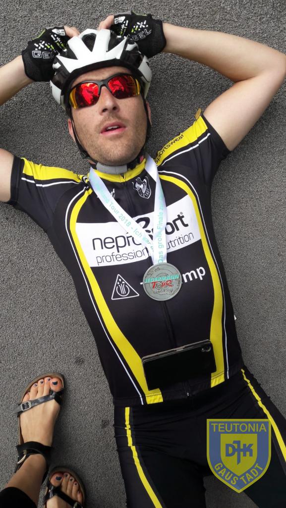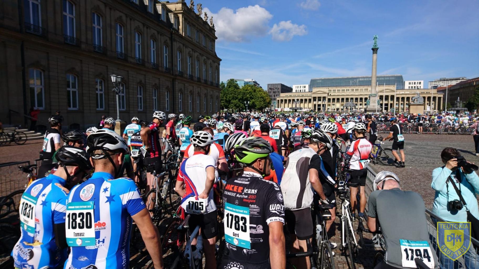 Dann war es soweit, es ging endlich los. Direkt durch die gesperrte Innenstadt von Stuttgart ging es raus Richtung Osten. Der Flache Kurs und das Fahren in einer größeren Gruppe ermöglichte eine irre Geschwindigkeit, 45 km/h waren locker drin, teilweise trat ich sogar über 50 km/h ohne größere Anstrengung. Aber mir war schon klar, dass das nicht ewig so weiter gehen würde, schließlich warteten ja noch rund 1300 Höhenmeter auf mich. Einfahrt in einen zweispurigen Tunnel, das einzige was man hörte war das irre Summen und Surren hunderter Laufräder auf dem Asphalt, Gänsehaut-Moment. Nach knapp 25 km dann die erste Steigung, die aber dann gefühlt auch schnell bewältigt war. Ich hatte mir die Strecke zwar mehrfach angeschaut und wusste auch, wo ich langfahren würde, aber während des gesamten Rennens hatte ich nur in wenigen Momenten wirklich eine Ahnung, wo ich jetzt genau war. Der Tunnelblick und der Rausch waren größer als gedacht. Durch Kirchheim unter Teck hindurch ging es dann weiter Richtung Norden durch das Nassachtal Richtung Schorndorf. Ziemlich langgezogene Steigung, bei der es auch über den höchsten Punkt der Tour ging. Bei der Abfahrt passierte es dann doch: An einer Kreuzung innerorts hab ich mich arg verschätz mit der Geschwindigkeit und bin dann nur noch scharf bremsend geradeaus gefahren. Glücklicherweise war die Straße hier nicht zu Ende und ich kam mit einem leichten Schrecken davon. Die Kette nach der Abfahrt fast ganz rechts dauerte es einige Momente, bis ich wieder in den Tritt gekommen bin. Kurzer Blick auf die Uhr: bereits 80 km in den Beinen. Ab diesem Moment ging der Kampf mit mir selbst los. Ich zählte jeden einzelnen Kilometer. Nach etwa 90 km wurde es dann richtig hart: Für eine Autobahnüberführung ging ich kurz aus dem Sattel und wollte im Wiegetritt hoch, als ich merkte, dass meine Oberschenkel begannen, zuzumachen. Na super, ich hatte immer noch im Hinterkopf, dass mich der Pragsattel auf den letzten Kilometern erwarten würde. Mit ordentlich Kraft zu treten war also nicht mehr drin. 25 km vor dem Ziel zeigte die Straßenbeschilderung Stuttgart nach links, Ludwigsburg nach rechts. Und das gesamte Fahrerfeld bog nach rechts ab! Mittlerweile schmerzten die Beine auch beim normalen Treten. Irgendwann kam jedoch das Ortsschild von Stuttgart und ich versuchte so gut es geht mit zu schwimmen. Immer wieder überholten mich „Züge“, ich hatte aber nicht ansatzweise das Gefühl, hier aufspringen zu können. Ich kam mir vor wie in einer alten rostigen Draisine. Für den Bruchteil einer Sekunde überlegte ich, kurz abzusteigen und mich an den Straßenrand zu legen. Aber der Gedanke verschwand schnell wieder. Weiter geht’s, nur noch wenige Kilometer! Und dann kam er, der Pragsattel! Ein gefühlt 25 % nicht enden wollender Anstieg. Irgendwann muss es doch bergab gehen? Entschädigt wurden die Teilnehmer für eine schöne Aussicht von oben auf die Stuttgarter Innenstadt, für die ich in diesem Moment aber weiß Gott keinen Blick hatte. Die letzten Kilometer. Es ging bergab, vorbei an der Universitätsbibliothek, mein Arbeitsplatz. Dann konnte es ja nicht mehr weit sein. Die Schilder kündigten es an, nur noch 500 Meter. Einige Fahrer um mich herum setzten zum Zielsprint an. Für mich überhaupt nicht dran zu denken, ich überlege mir, wie ich vom Rad kommen soll ohne zu krampfen. Vielleicht einfach seitlich an die Bande fallen lassen. Die letzten Meter, die Zuschauer stehen entlang der Strecke und machen ordentlich Krach, Sandra ruft mich und winkt mir zu. Schließich die Ziellinie: Geschafft, nach 3:41 h war die 117,5 km lange Strecke bezwungen. Die ca. 500 Meter lange Ausrollzone brauche ich nur wenige Meter, nichts geht mehr. Absteigen ging dann überraschender Weise doch ganz gut. Nach dem Empfang der wohlverdienten Medaille wollte ich mich nur noch hinlegen. Was für eine Erfahrung, ich gestehe mir ein, die Sache vielleicht doch ein klitzeklein wenig unterschätzt zu haben. Sandra findet mich und versorgt mich mit einem alkoholfreien Weizen. Der Schmerz lässt nach und nach ein paar Minuten kann ich wieder einigermaßen gehen.