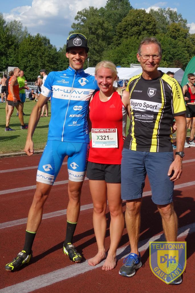 An erster Stelle liegend übernahm Carina den Transponder und startete auf die 7,3 km lange anspruchsvolle Laufstrecke. Der Anstieg zur Wallburg ist auf der Laufstrecke die größte Herausforderung und die warmen Temperaturen machten es nicht einfacher. Carina wechselte zwischen den Treppenstufen und dem Trampelpfad daneben hin und her. Nachdem sie die Burg umrundet hatte, ging es über Feldwege und durch das Neubaugebiet von Eltmann erstmal bergab. Carina konnte sich etwas treiben lassen und das Laufen fiel ihr hier sehr leicht. Wie auch vor zwei Jahren standen viele Hausbesucher mit Rasensprengern am Straßenrand und boten den Läufern eine Abkühlung. Auch sonst waren wieder sehr viele Zuschauer an der Strecke oder feuerten die Sportler vom Balkon oder Fenster aus an. Die letzten zwei Kilometer verliefen parallel zum Main entlang und hier musste sie ein wenig kämpfen, um das Tempo zu halten. Beim Einlauf ins Stadion wurde sie aber dann nochmal richtig von den Zuschauern "getragen" und im Ziel gebührend von Uli und mir empfangen. Nach 1:35:59 lief Carina ins Ziel. Den Streckenrekord von 2016 hatten wir um über eine Minute verbessert.