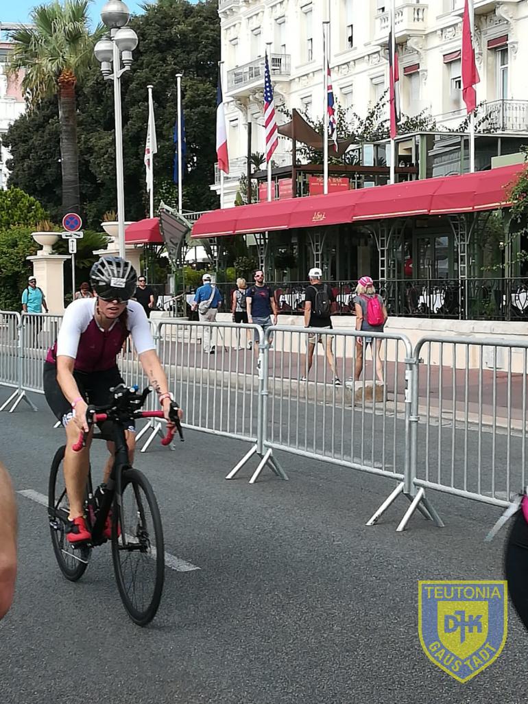 Weiter ging es auf dem Rad. Dies ist meine Paradedisziplin, zumindest im flachen/ windigen Gelände. Das Streckenprofil über den Col de Vence ist selektiv, da es durch die Anzahl der gut 1500 Höhenmeter auf Dauer sehr krafteraubend ist. Die eigentliche Herausforderung bestand jedoch im Abfahren. Durch die engen Kurven, die vielen Straßenunebenheiten und Schlaglöcher entstanden viele Defekte und Unfälle. Glücklicherweise konnte ich auch diesen Part ohne Zwischenfälle absolvieren. Zwischenzeitlich blieb sogar Raum, um die atemberaubende Sicht über die Berge auf das Meer zu genießen. Das Starterfeld am Samstag hatte gut 1000 Athleten weniger, als bei den Herren am Sonntag. Die Radstrecke war dadurch deutlich leerer und wahrscheinlich auch einfacher zu fahren. Die Männer aus der gemeinsam angereisten Männertruppe sollten am nächsten Tag weniger Glück haben.