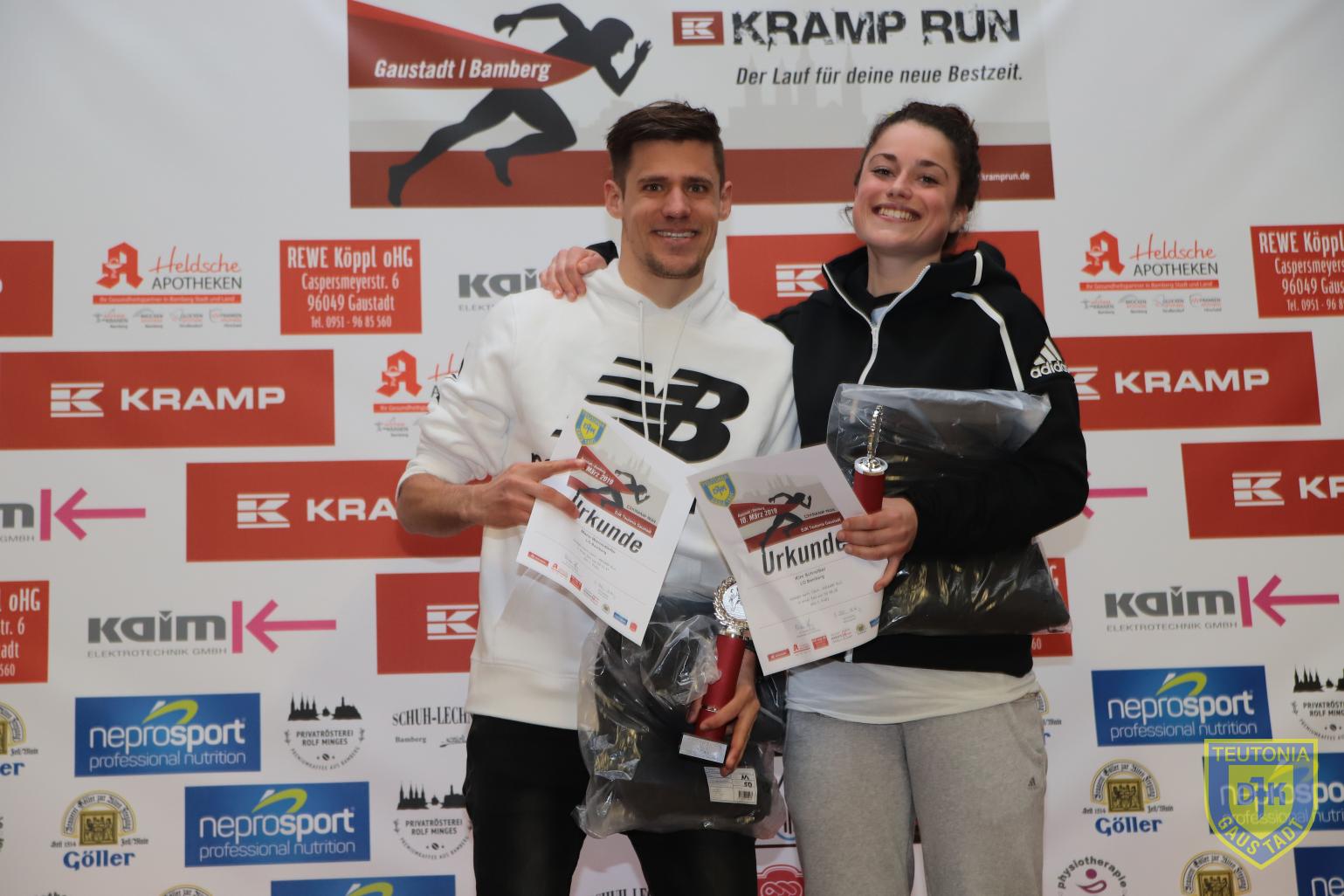 Das Wetter wurde immer ungemütlicher, der Wind nahm zu aber das schreckte keinen der Teilnehmer ab, denn jetzt wurde es ernst und knapp 580 Läuferinnen und Läufer sammelten sich an der Startlinie für die 4 Runden des Kramp Runs. Von Anfang an setzten sich die 2 Favoriten Mario Wernsdörfer und Profitriathlet Andi Dreitz bei den Herren vom Hauptfeld ab. Andi Dreitz ging das Rennen schnell an musste aber in der 2ten Runde den Vorsprung an Mario Wernsdörfer (LG Bamberg) abgeben. So konnte sich Wernsdörfer den Sieg bei der 10ten Auflage des Gaustadter Straßenlaufes in 31:37 sichern. Dreitz (SV Bayreuth/ Erdinger Alkoholfrei) überquerte die Zielinie nach 32:32. Christian Gründel vom TSV Staffelstein (34:07) komplettierte das Trio bei den Herren. Bei den Damen konnte sich Kim Schreiber von der LG Bamberg den Sieg in 38:26 sichern, gefolgt von Steffi Glink (TV Viktoria Augsburg, 40:50) und Kathrin Werner (HUK-Coburg Run and Bike Team, 41:02).