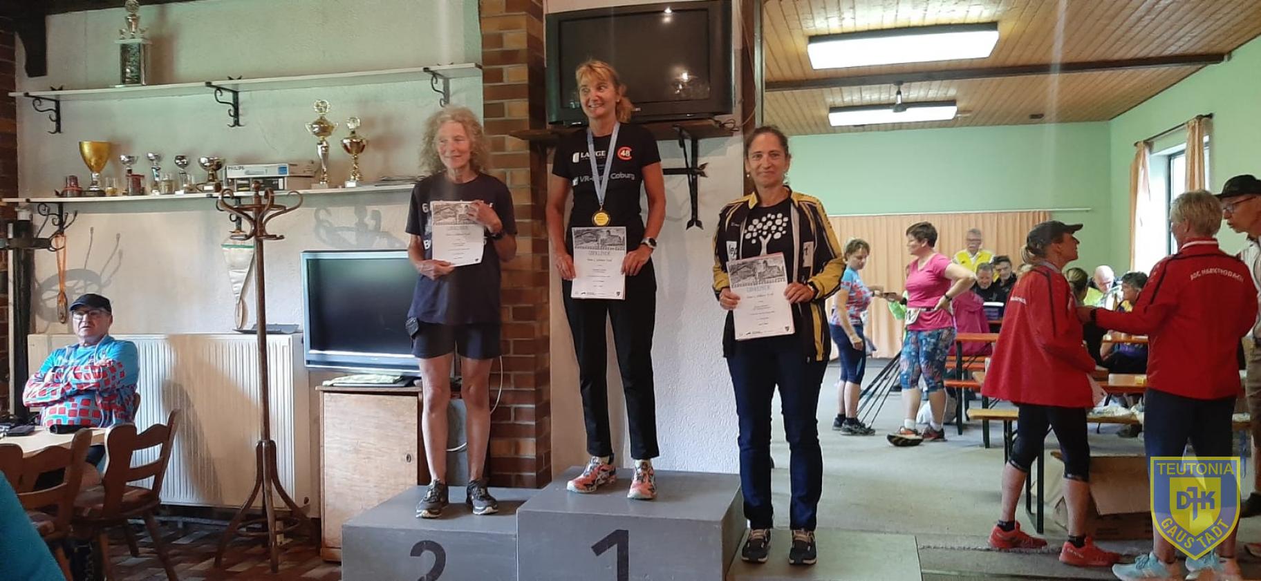 Am Sonntag 22.08. fand zum 2ten Mal die oberfränkische Meisterschaft im Rahmen des Höhner Berglaufes statt. Da ich sehr gerne auf Trailstrecken unterwegs bin war das eine gute Gelegenheit mal wieder Wettkampfluft zu schnuppern. Gisi hatte mich beim letzten Stammtisch darauf aufmerksam gemacht und so starteten wir am Sonntag früh gen Coburg, denn da sollte das Ganze stattfinden. Ganz Corona konform mussten wir, bevor wir auf das Gelände des SV Höhn durften unseren digitalen Impfnachweis zücken. Wir hatten keinerlei Vorstellung was uns bei dem Lauf erwarten würde. Traillauf konnte ja alles Mögliche bedeuten 😉. Nachfragen meinerseits ob es eine Streckenbeschreibung gibt, „nein, es geht halt rauf und runter und passt auf der Strecke etwas auf heute Nacht hat es geregnet und es könnte rutschig sein“. OK dachte ich mir, das kann ja heiter werden, gut dass ich meine Trailschuhe mit gutem Profil angezogen hatte. Pünktlich um 9:45Uhr ging es dann quer über den Sportplatz los und sofort ins Unterholz. Auf teilweise sehr schmalen Pfaden durch den Wald rund um Bergdorf, was seinen Namen redlich verdient hat. Nach etwa 2 km die erste Steigung, vor mir ein Läufer „ach herrjeh!“. Die Steigung war wirklich nicht zu verachten. Keiner rannte mehr sondern jeder ging jetzt nach oben. Im Laufe des Rennens gab es noch 2 weitere Anstiege in dieser Art. Ansonsten nur kleine Pfade über Wurzelwerk, manchmal für 50 Meter wieder ein Weg. Auf gut 11,5km über 300 Höhenmeter! Gisi und ich haben uns wacker geschlagen. Gisi sicherte sich in der W50 den 2. Platz in 1:28:22 und ich erreichte Platz 3 in der W55 mit 1:20:59 und da ich mich auch für die oberfränkische Meisterschaft gemeldet hatte auch hier Platz 3 in meiner AK.